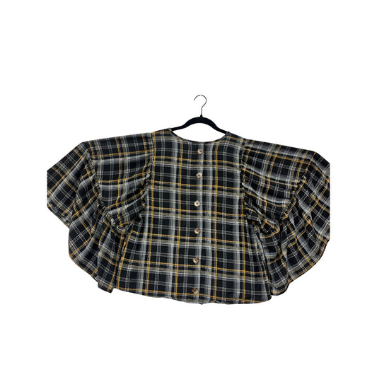 Plaid Bell Sleeve Top Womens M Blu Pepper Black/Yellow Button Back #6916