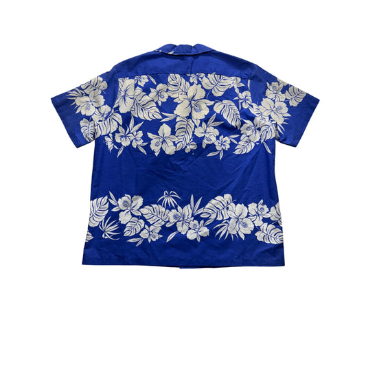 Vintage Helenas Hawaiian Blue & White Floral Button-Up Shirt With Pocket #9577