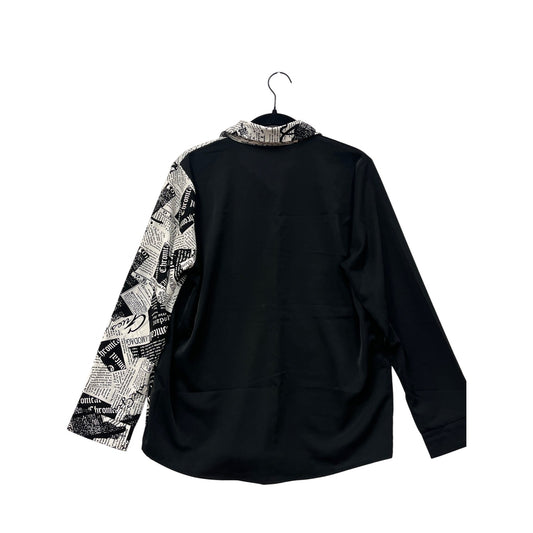 Black & White Button-Up Shirt With Newspaper Print Long Sleeves Yong Fong Womens M Lightweight Casual Fit #6903