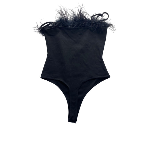 Black feather trimmed bodysuit tank top #5472