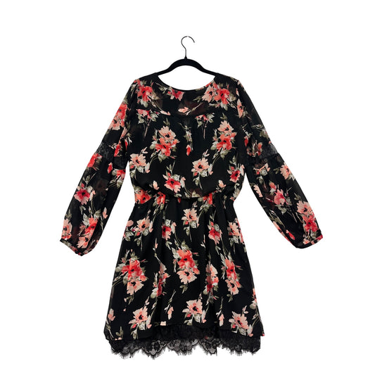 White House Black Market Floral Lace-Trim Dress Womens 10 Black & Red Long Sleeve #6876
