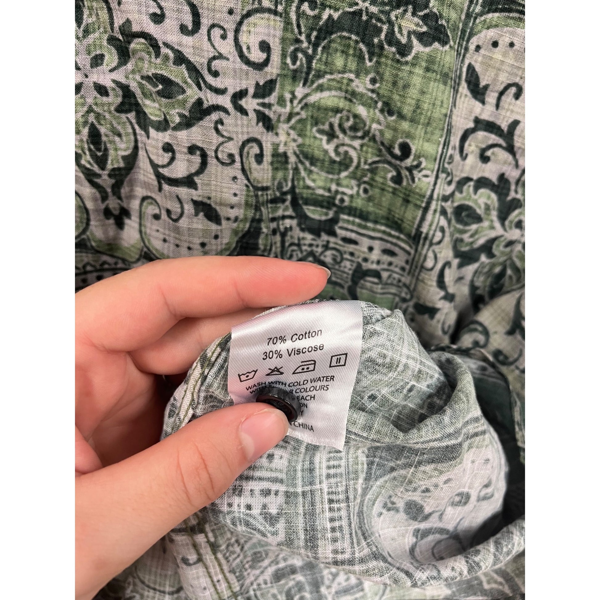 This shirt features a sophisticated green pattern with short sleeves and a button-up design. Crafted from a cotton-viscose blend for comfort and durability.