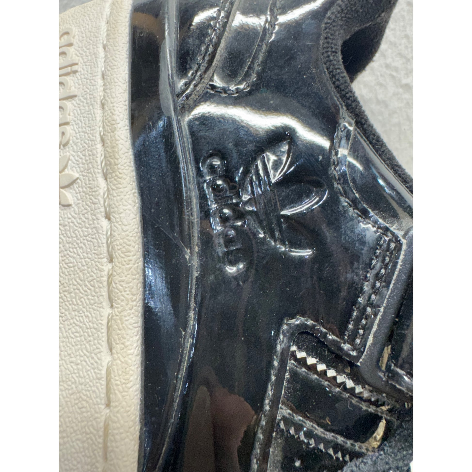 • Black patent leather upper