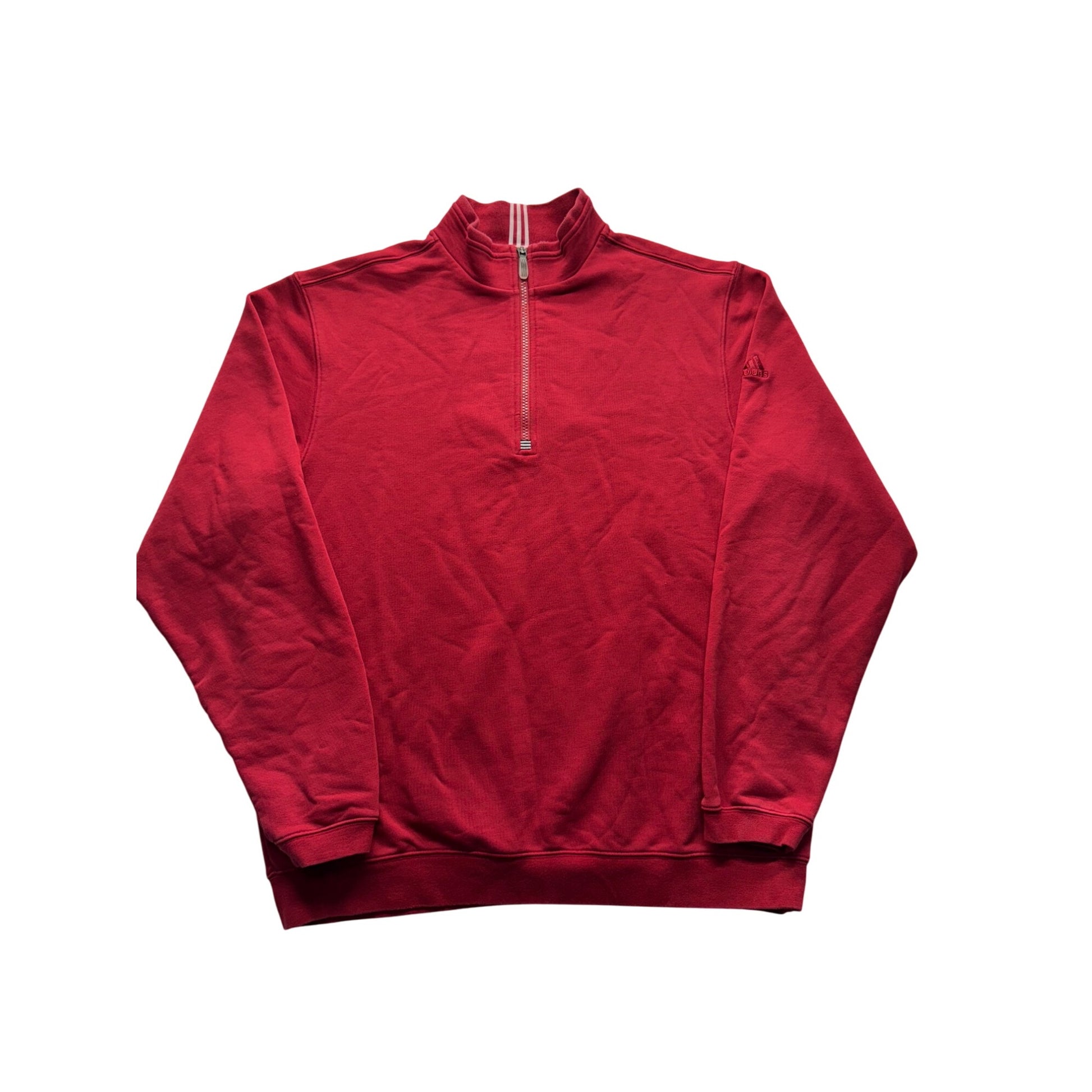 This Adidas quarter-zip sweatshirt is crafted with a cotton blend for comfort and durability. Its sleek design and vibrant red color offer a stylish yet functional choice for casual wear.