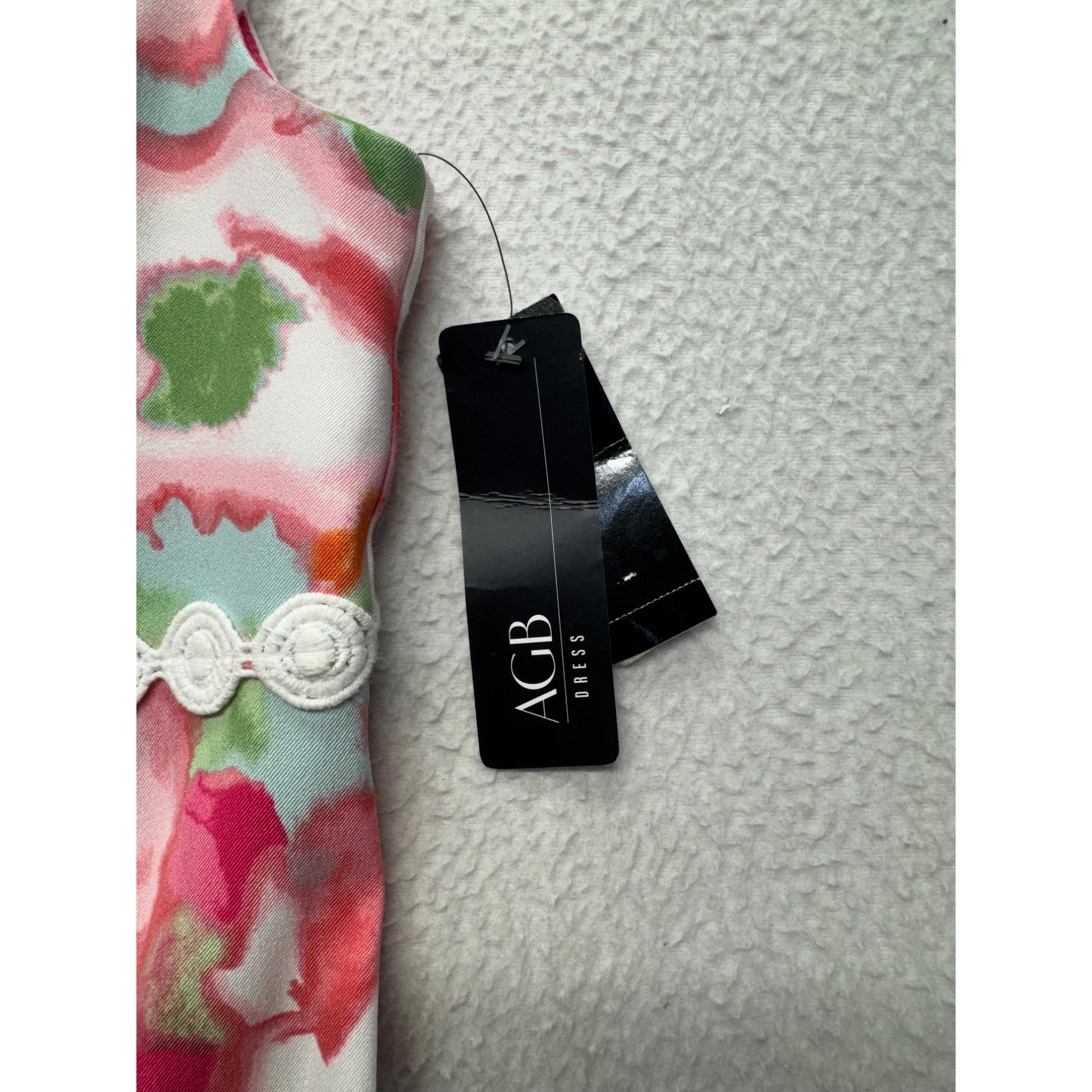 This sleeveless AGB dress combines a vibrant floral design with delicate lace accents, offering a polished look suitable for professional or semi-formal settings.