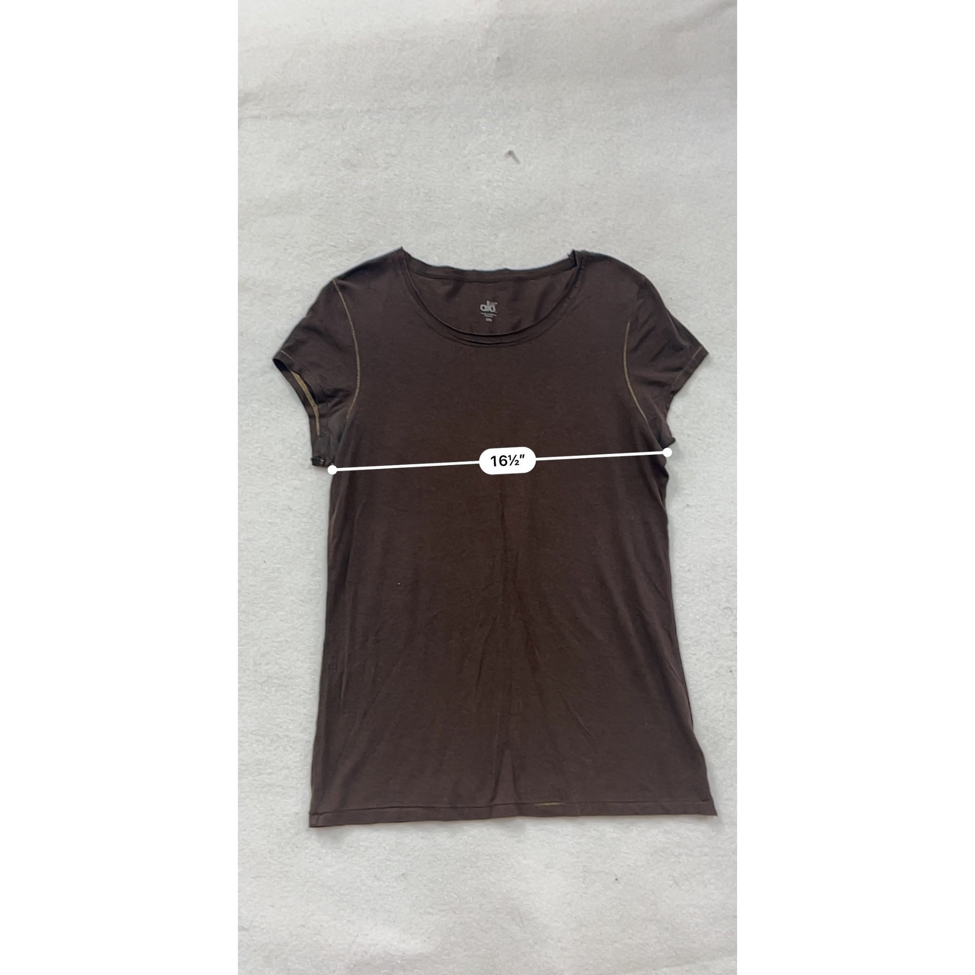 This Alo t-shirt is crafted from a soft bamboo, cotton, and spandex blend, offering comfort and style. The short sleeves and scoop neck design complement its versatile brown shade, suitable for casual or activewear needs.