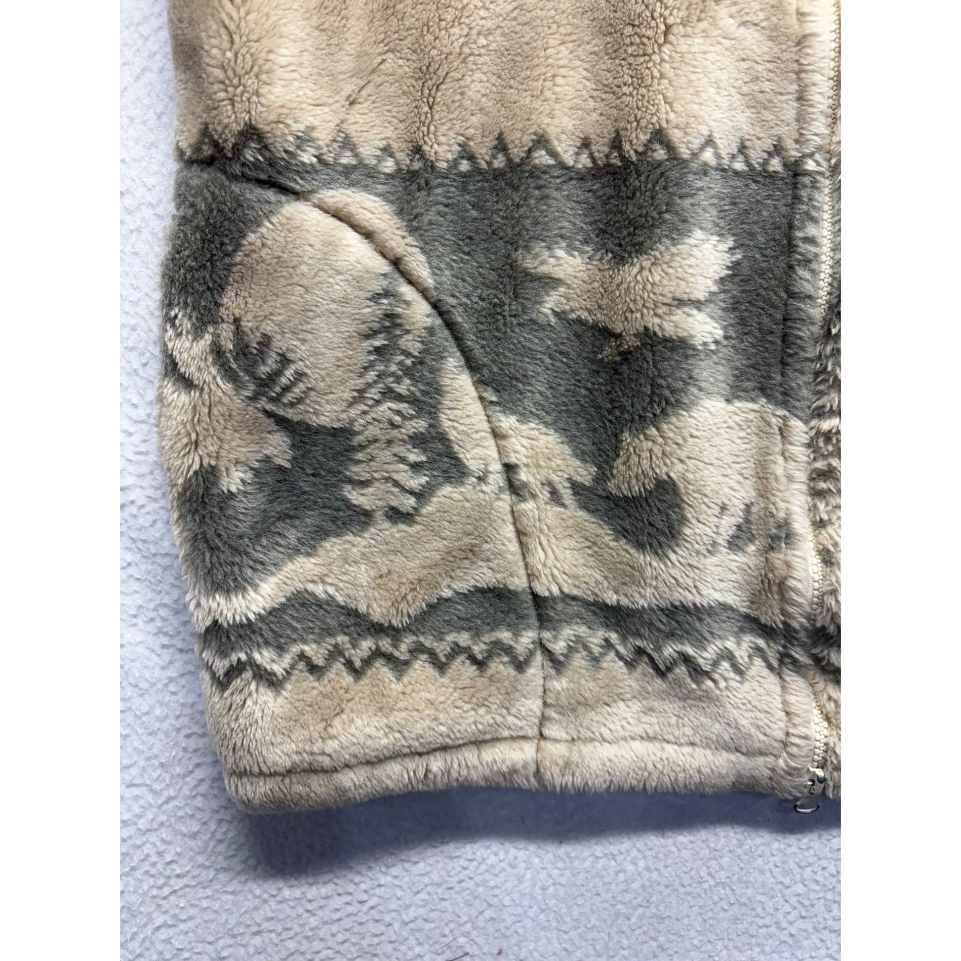 Soft and cozy fleece jacket featuring a serene wildlife scene with moose and bears. Hooded for extra warmth and a full zip closure for convenience.
