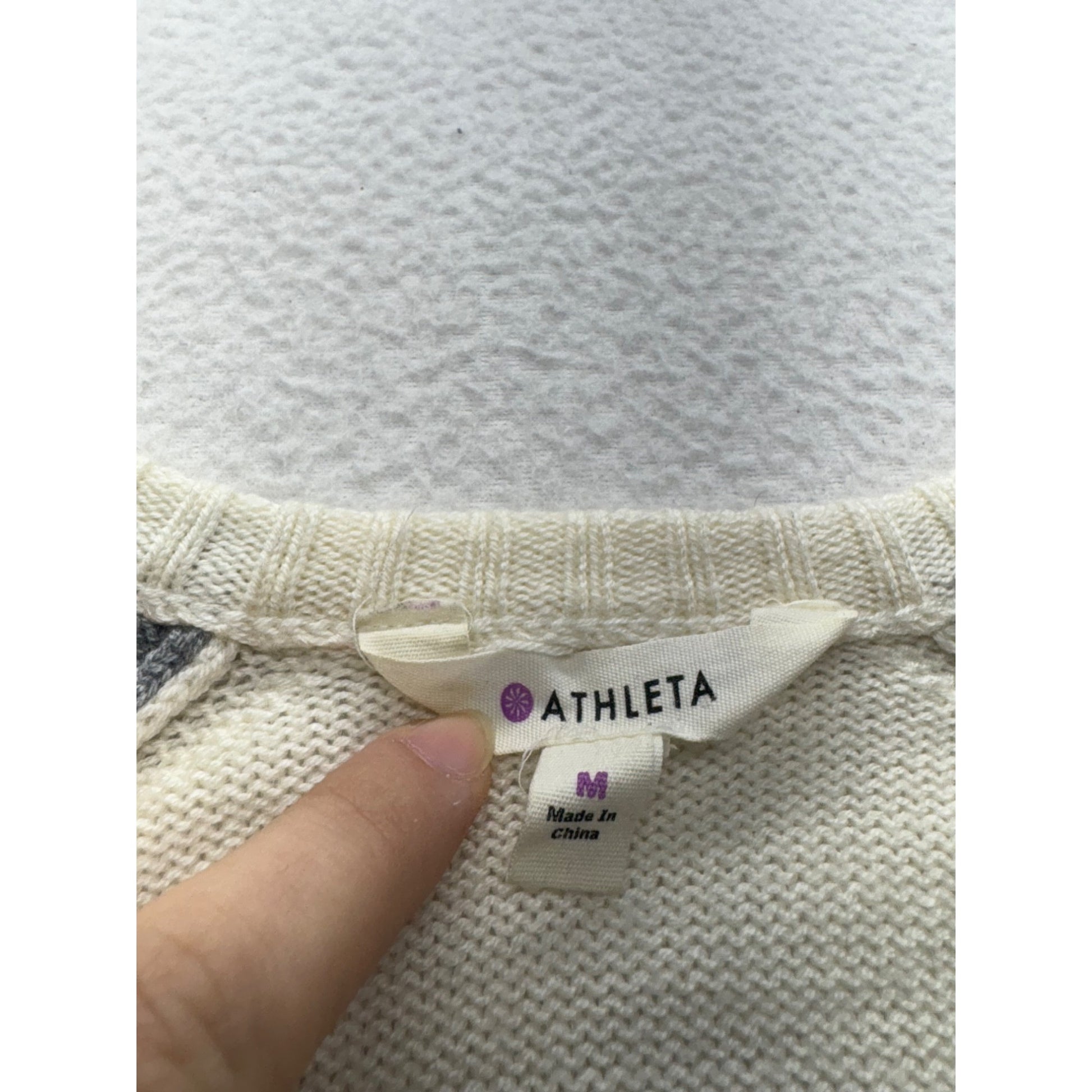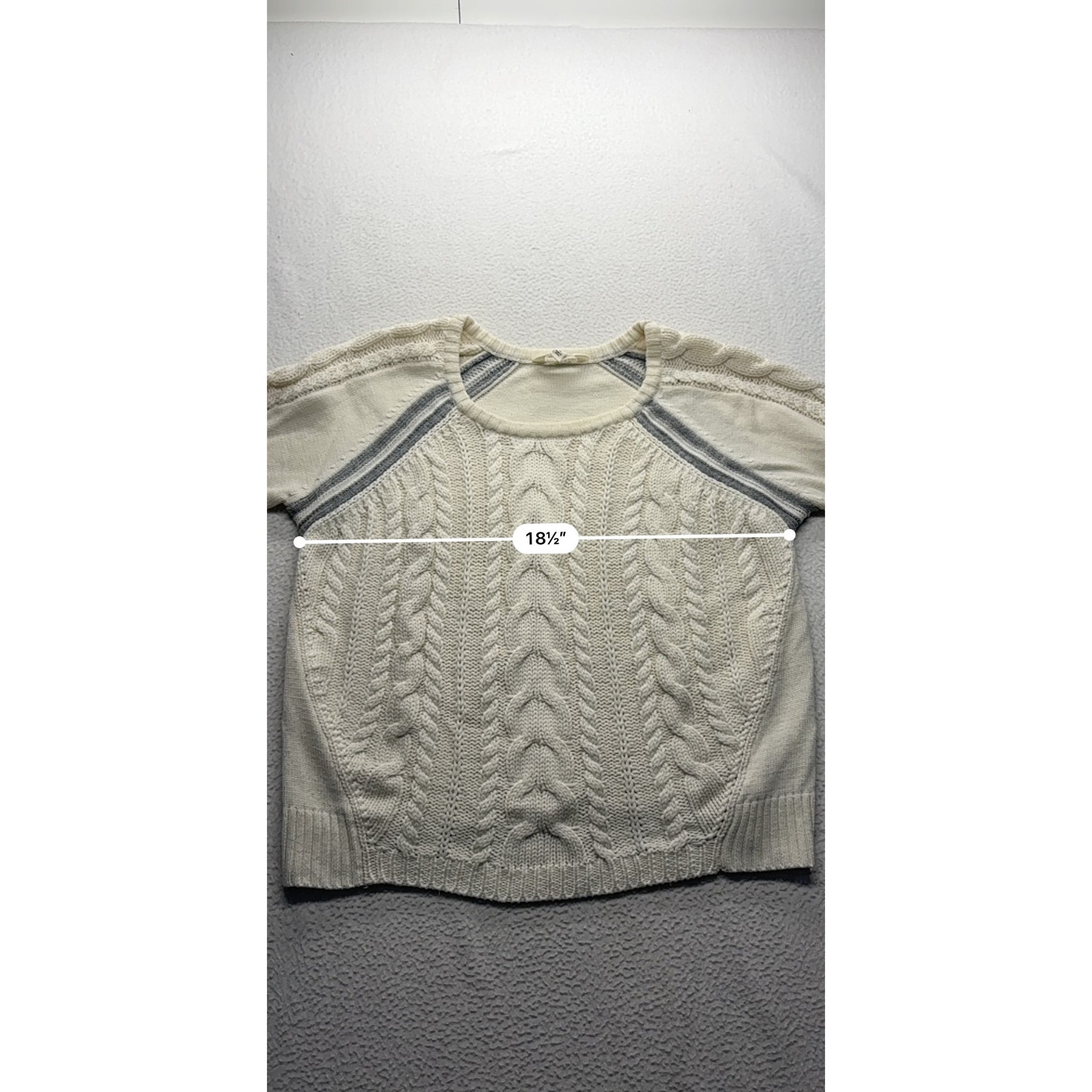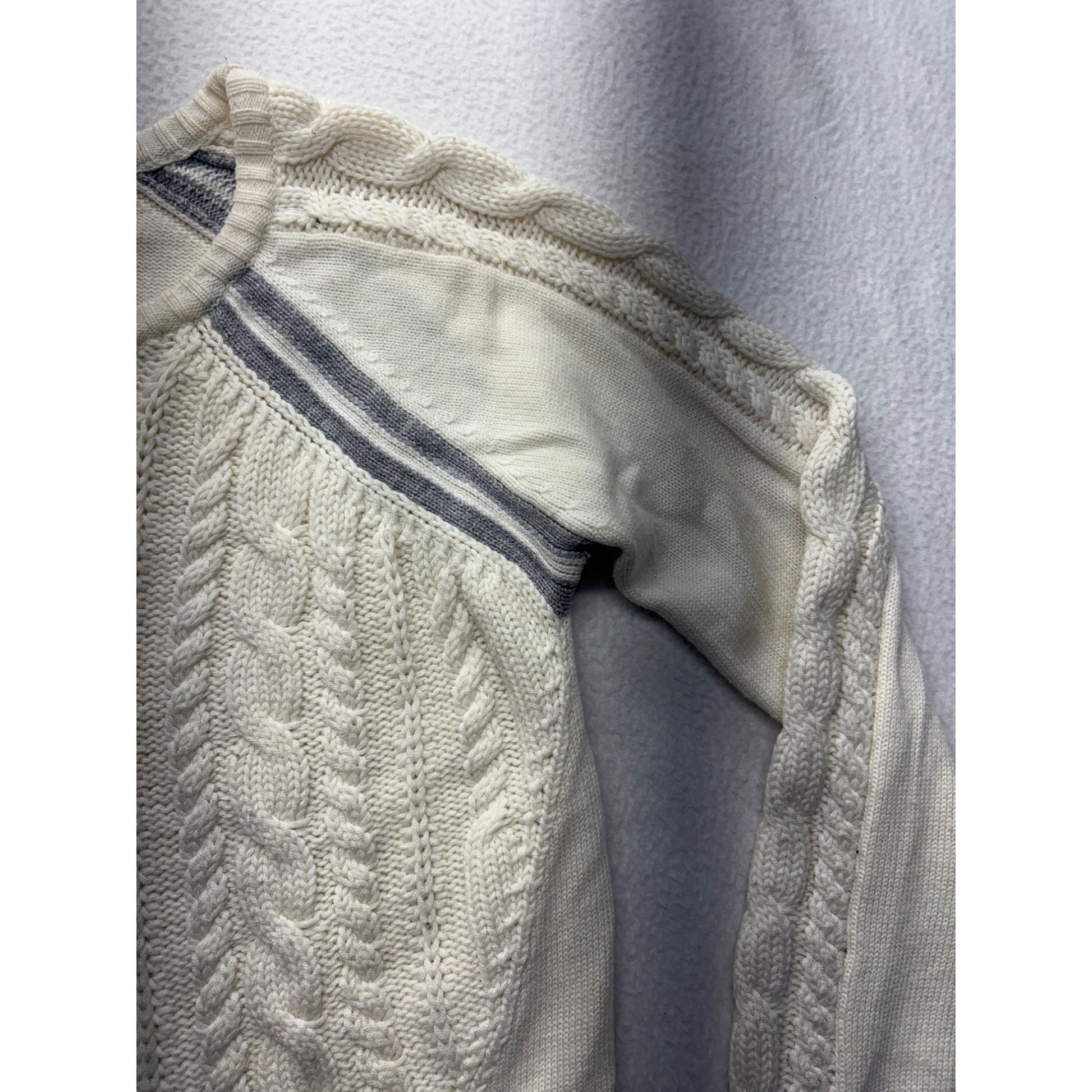 This medium-size cable knit sweater features a cozy wool blend, a classic cream color accented with gray, and stylish long sleeves.