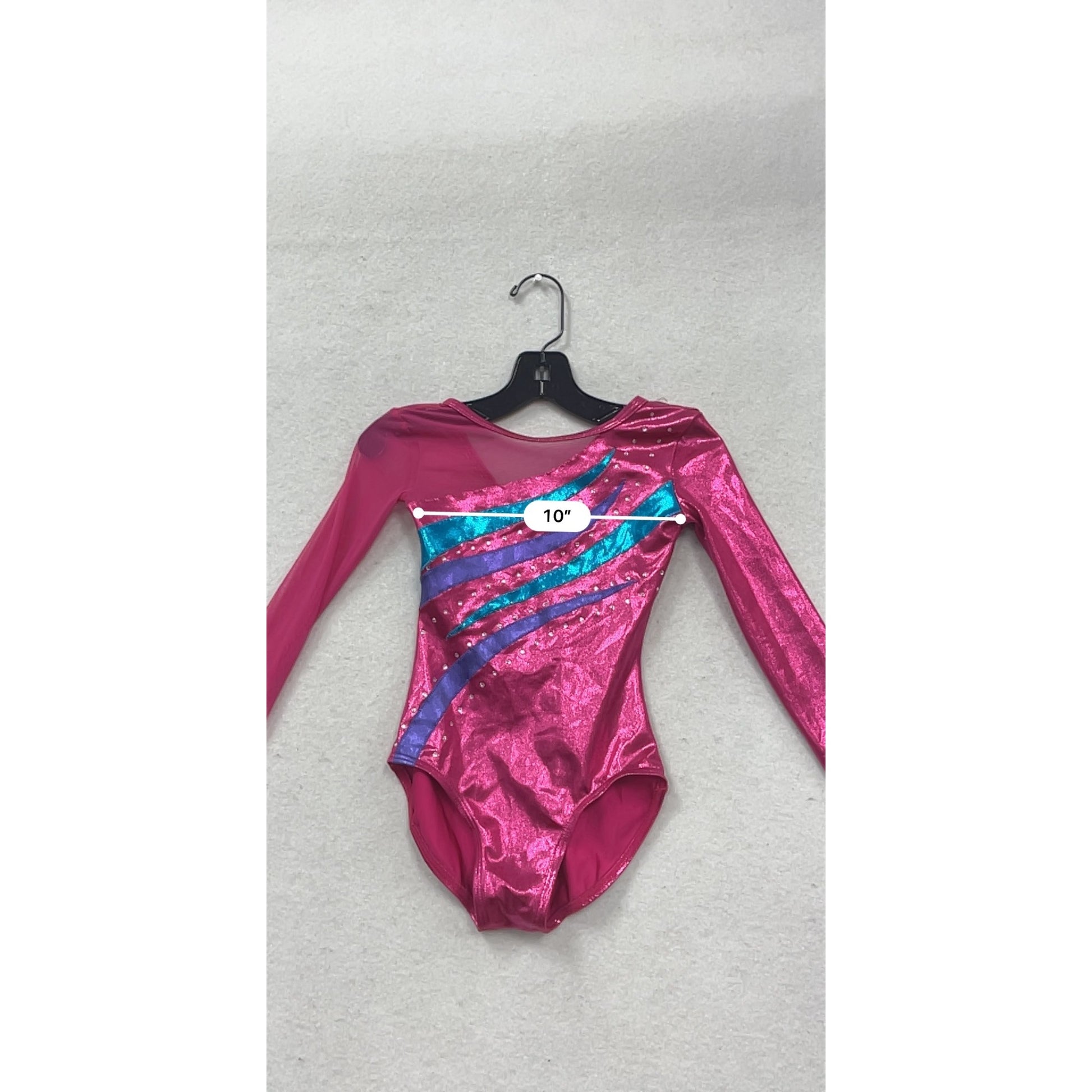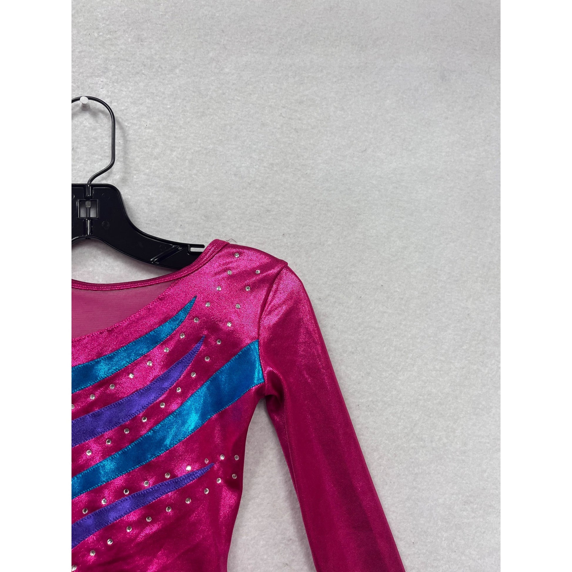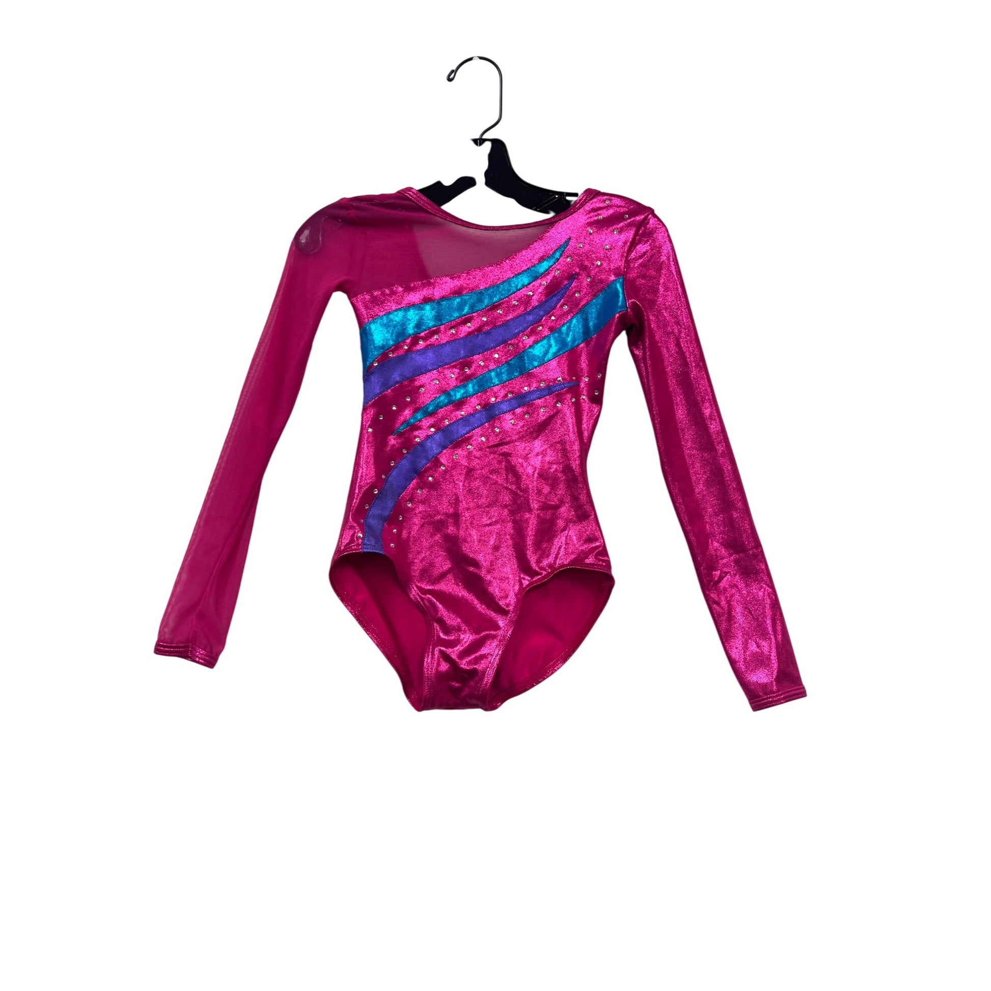 This striking gymnastics leotard from Balera is designed for young athletes seeking style and functionality. The long-sleeve design ensures coverage and warmth, while the metallic pink fabric with blue and purple stripes adds a vibrant touch. Ideal for practice sessions and performances, this leotard combines comfort with eye-catching appeal.