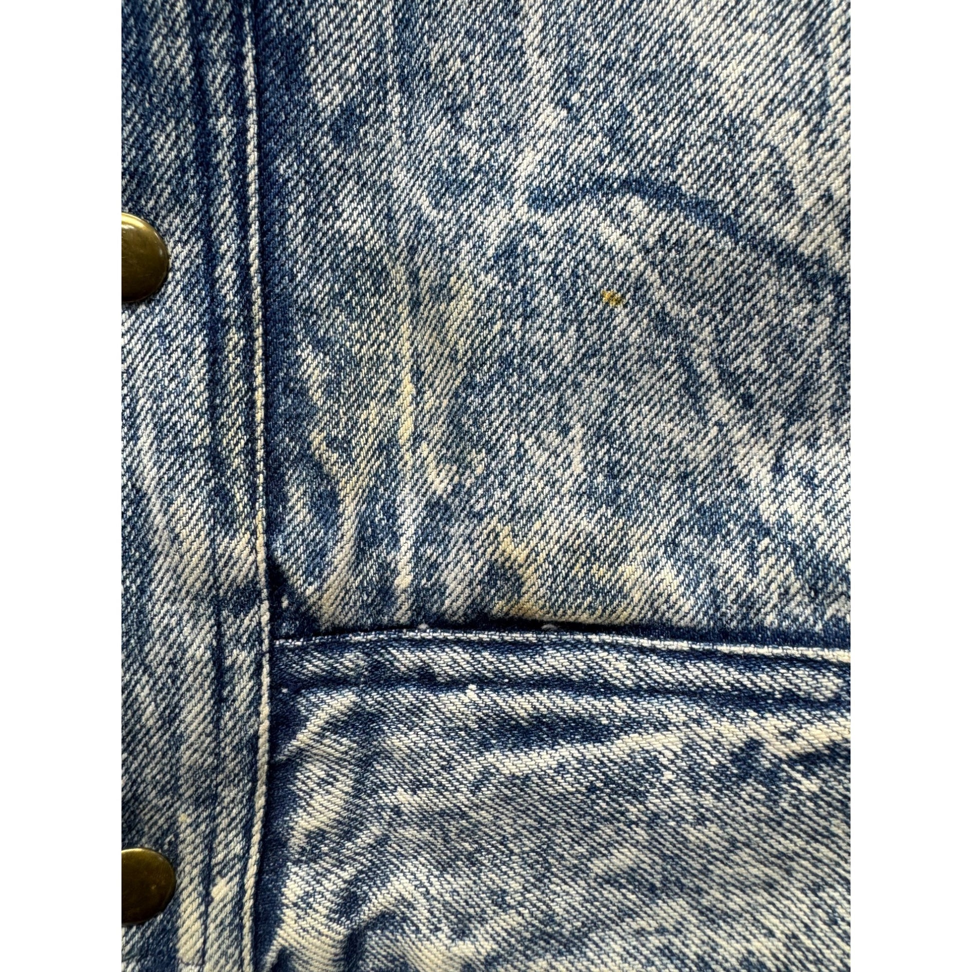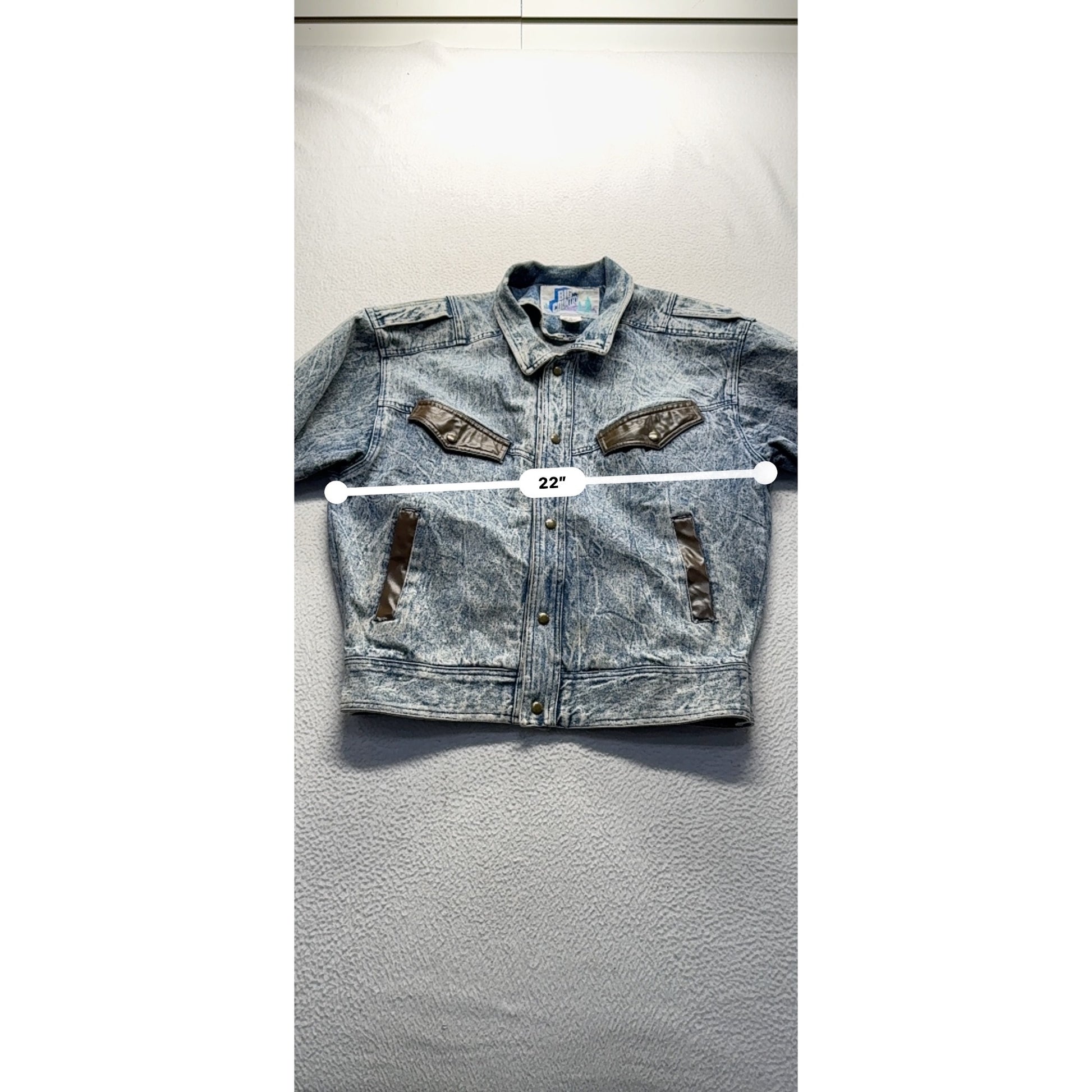 This acid wash denim jacket offers a timeless design with its durable cotton material and stylish brown faux leather accents. Crafted for reliable wear, it features functional snap closures and pockets, making it a practical addition to wardrobes.