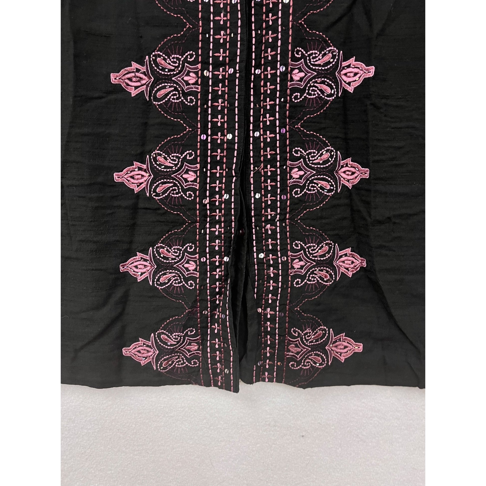 This black tunic top features intricate pink embroidery along the front and collar. Its lightweight silk blend fabric offers a polished and comfortable wear.