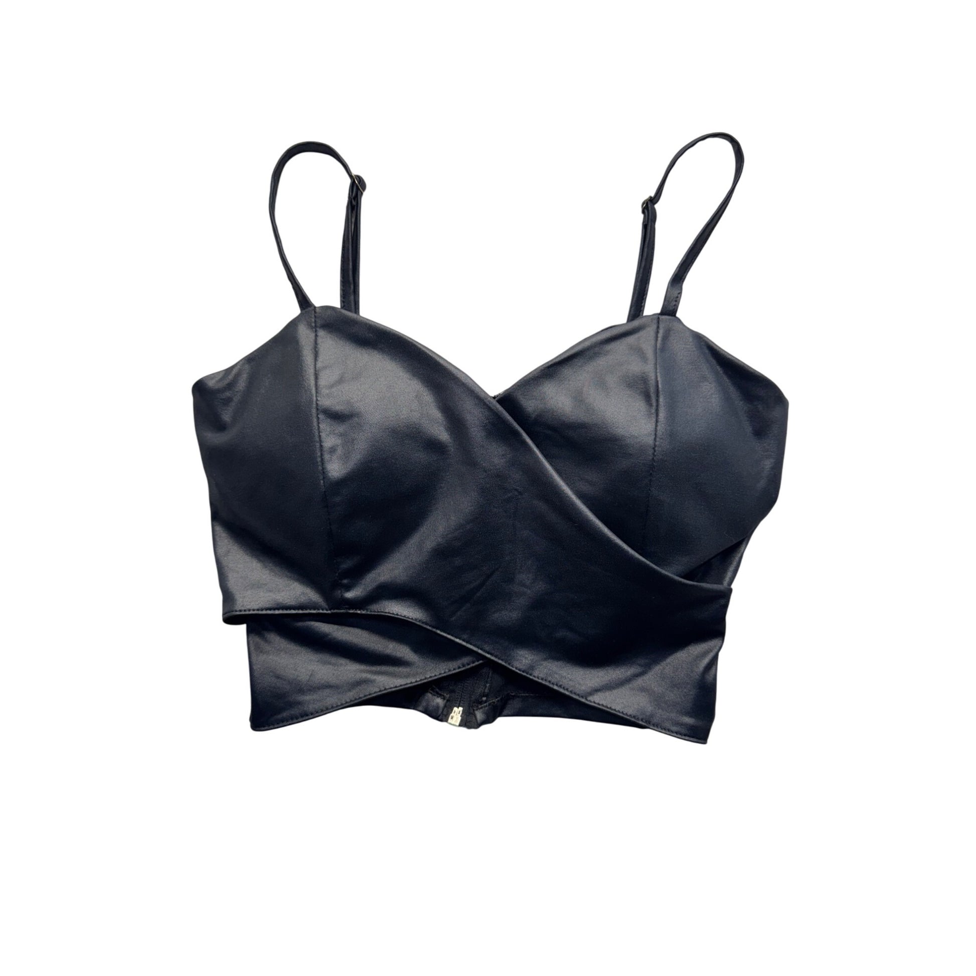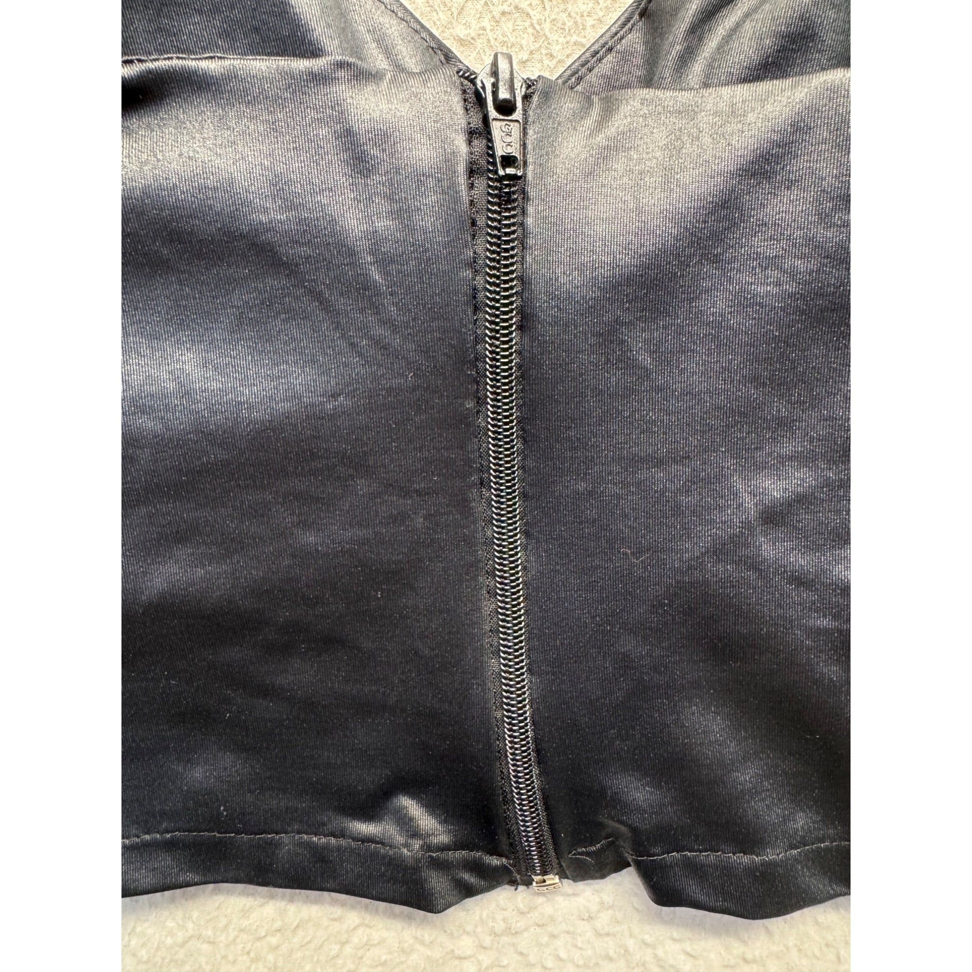 A sleek black satin cropped tank top with adjustable straps and a secure back zipper. Ideal for creating an elegant and modern look.