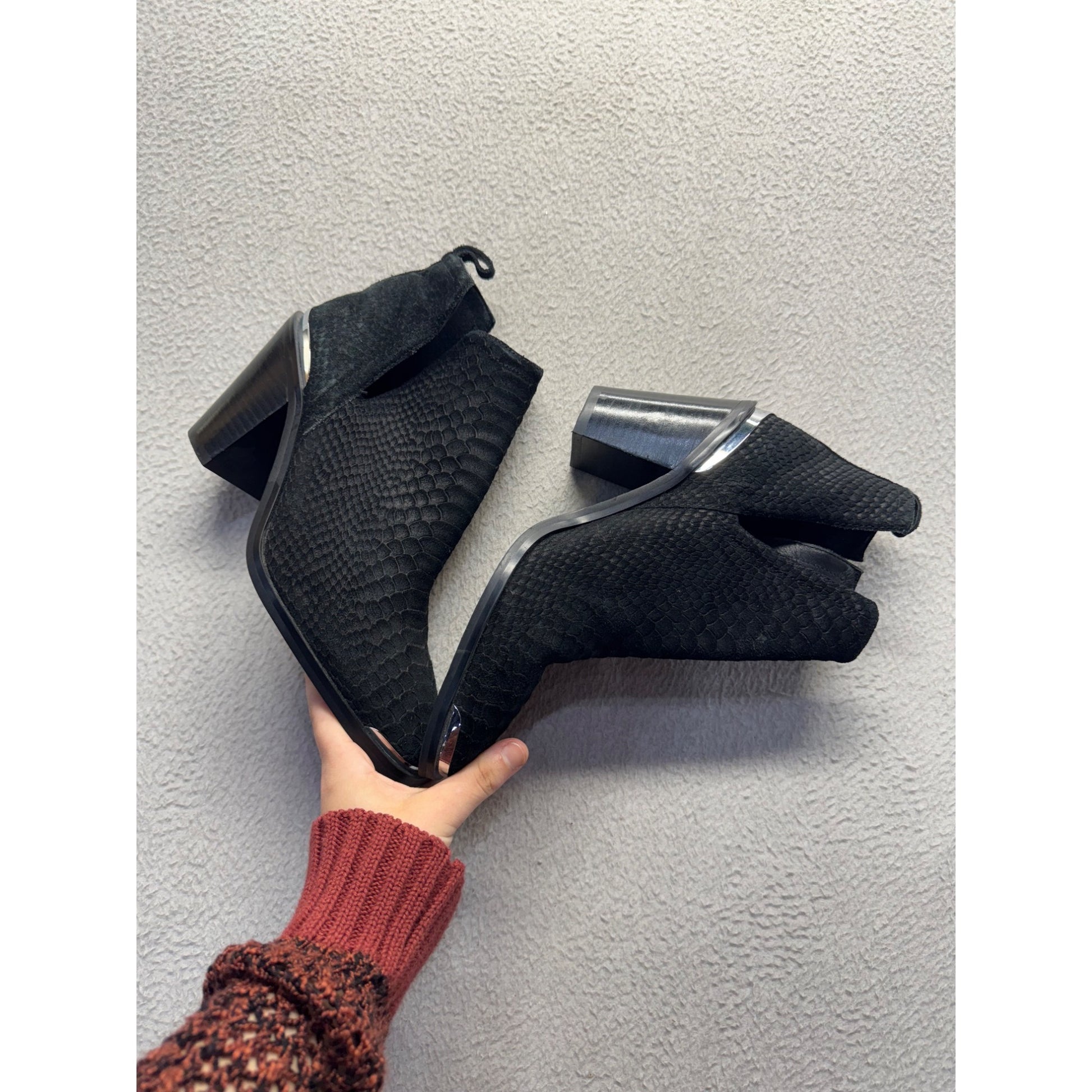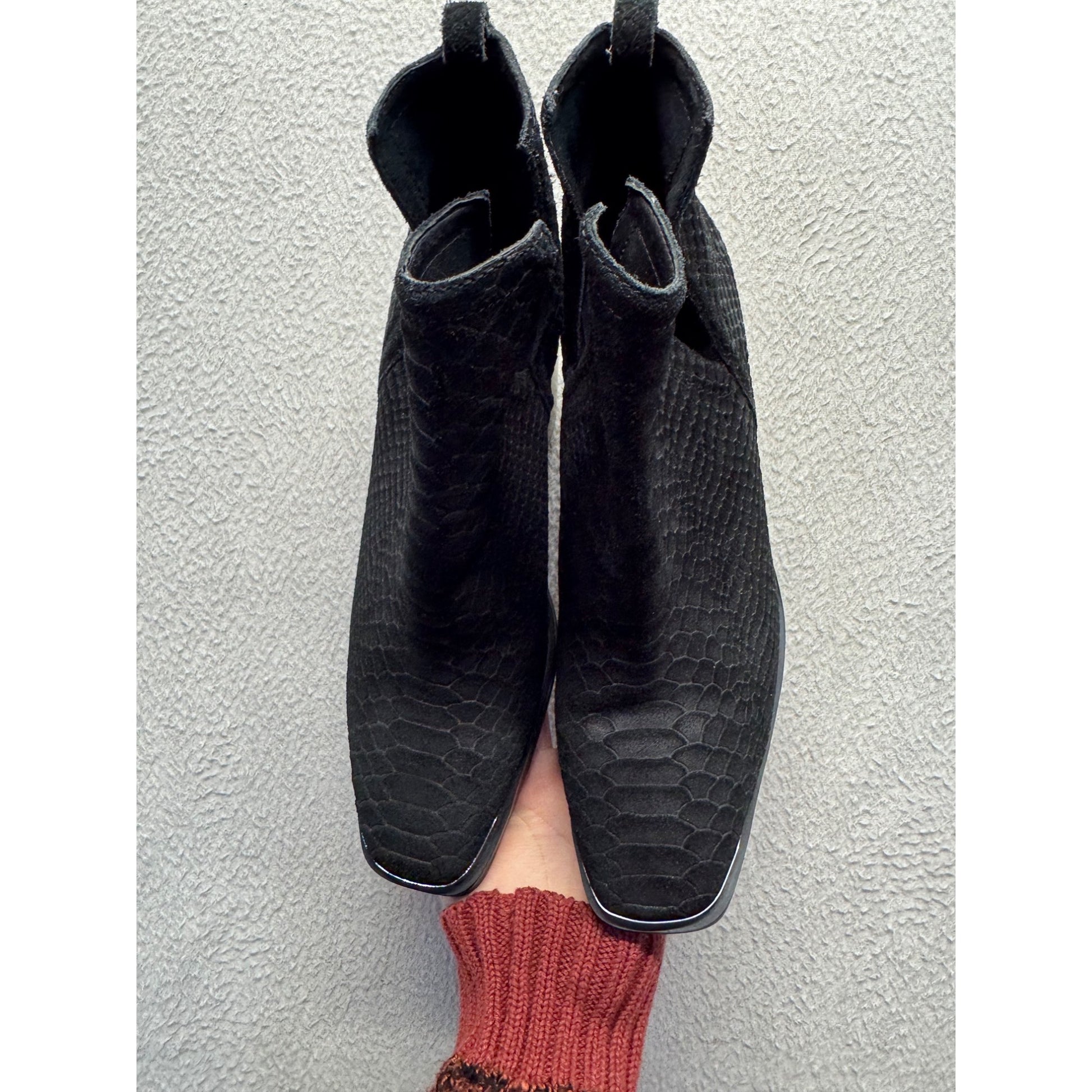 These black ankle boots offer a sophisticated yet bold look, perfect for adding a touch of elegance to any wardrobe. The snake print texture creates a unique and fashionable design while the square toe and block heel provide comfort and stability. Ideal for both casual and formal settings.