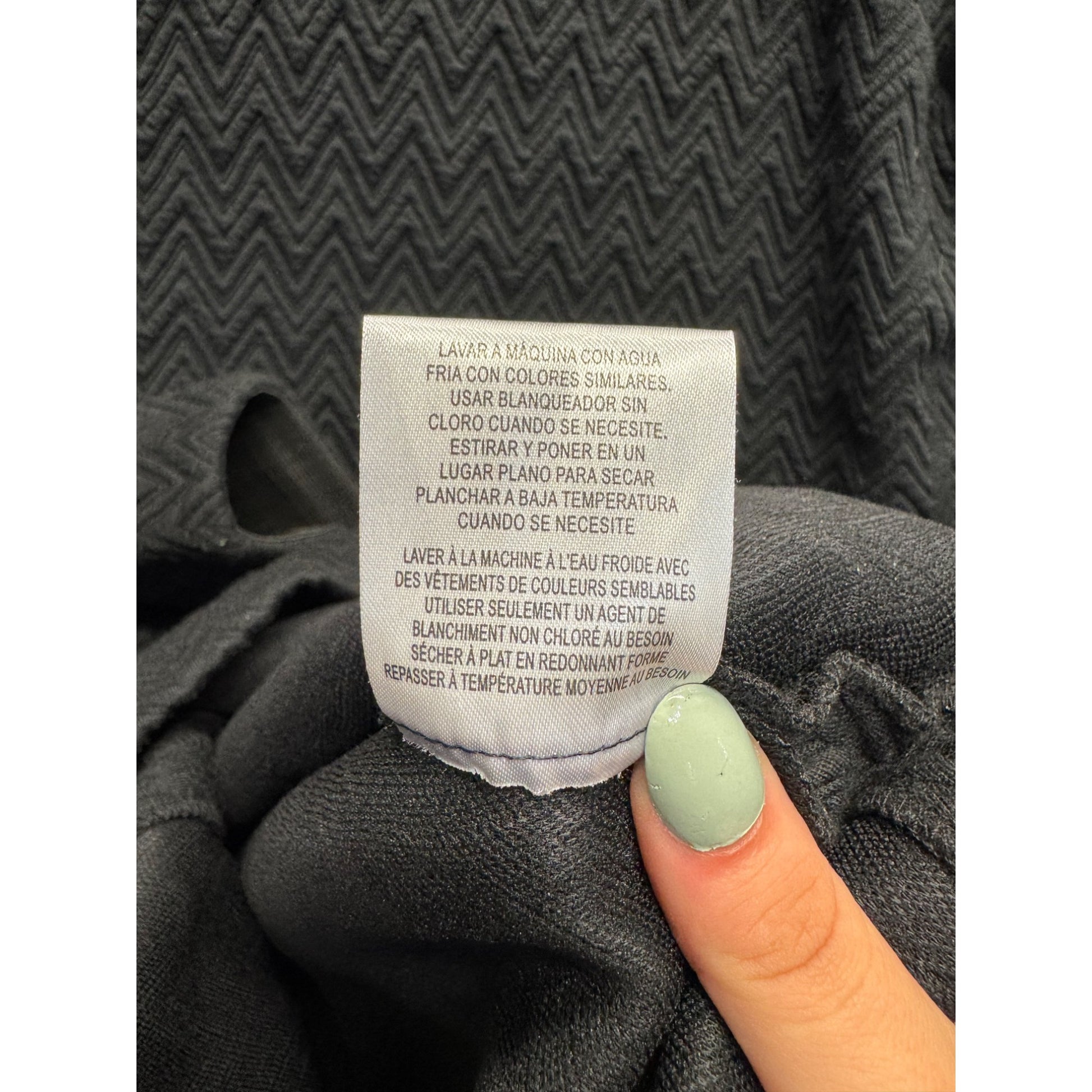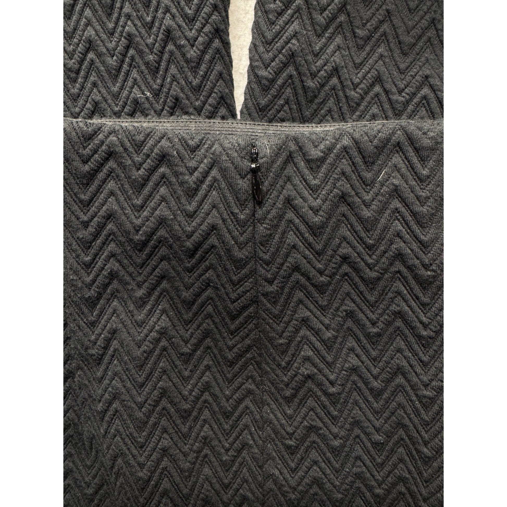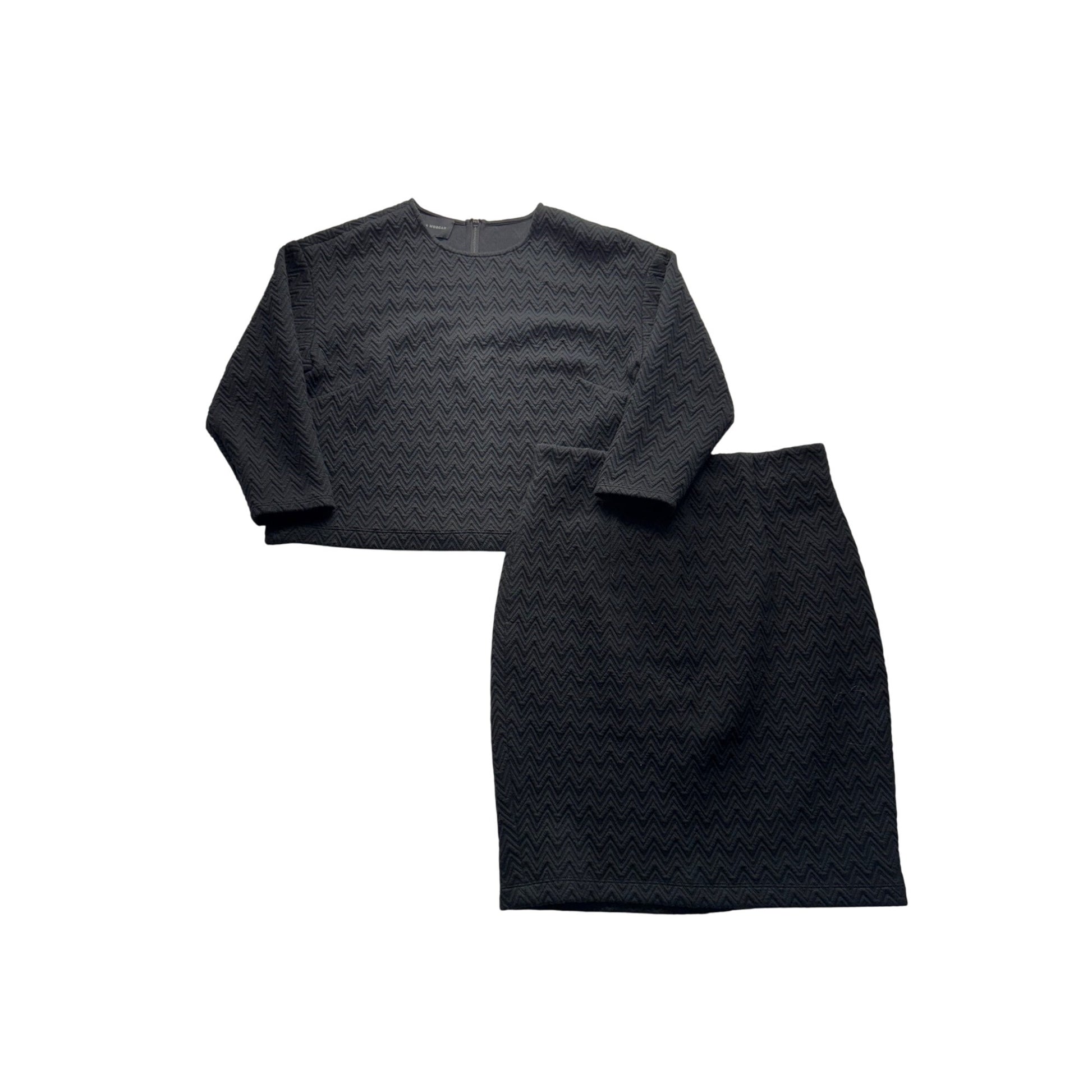 This two-piece black set offers a textured zigzag pattern, featuring a cropped top with 3/4 sleeves and a matching skirt with a flattering silhouette.