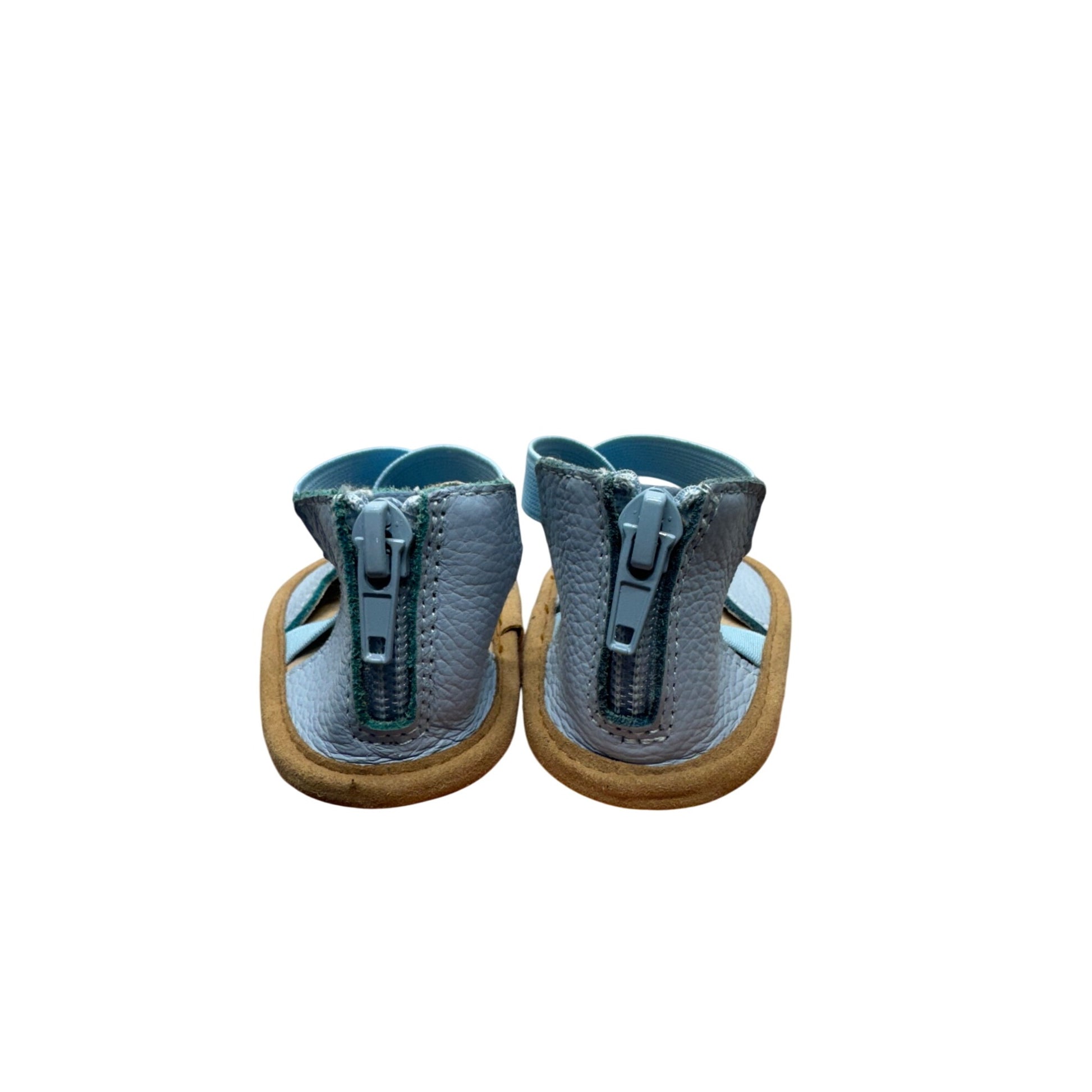 Meticulously crafted infant shoes featuring soft leather upper in a serene blue hue, designed with cross-body elastic straps and a secure zip closure. Constructed with a flexible suede-like tan sole for early mobility and comfort.