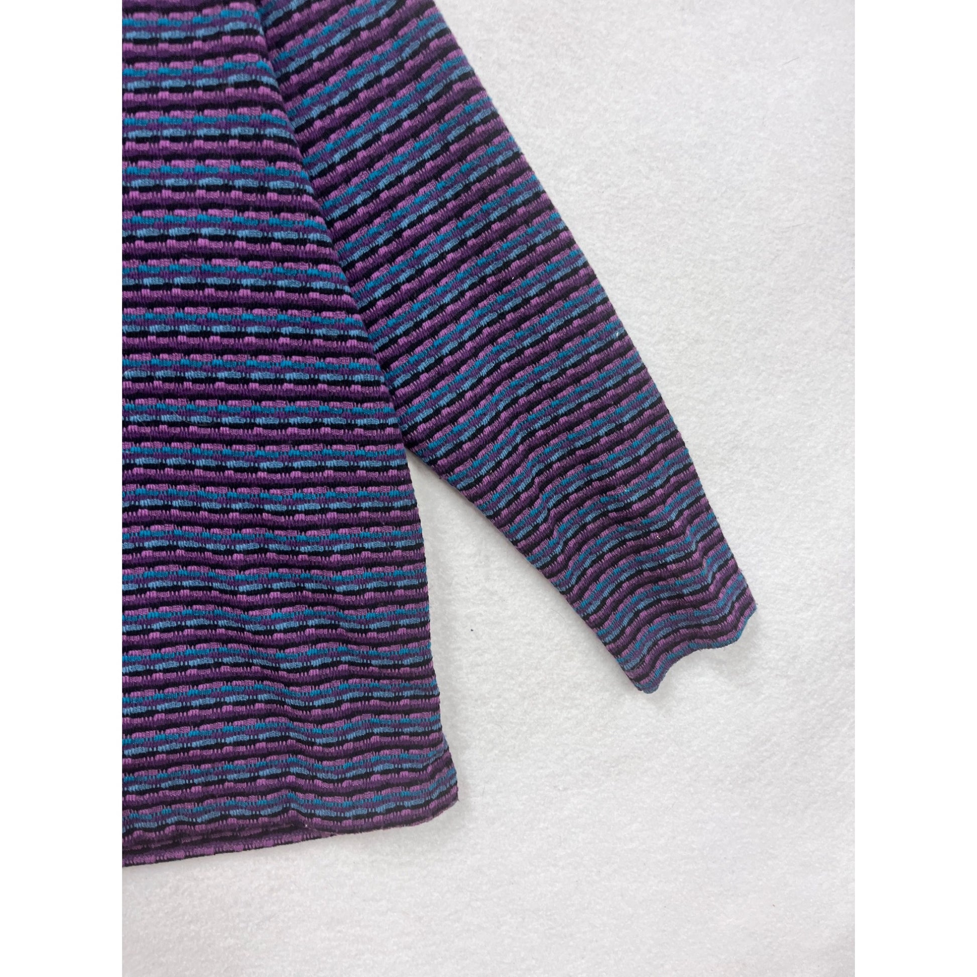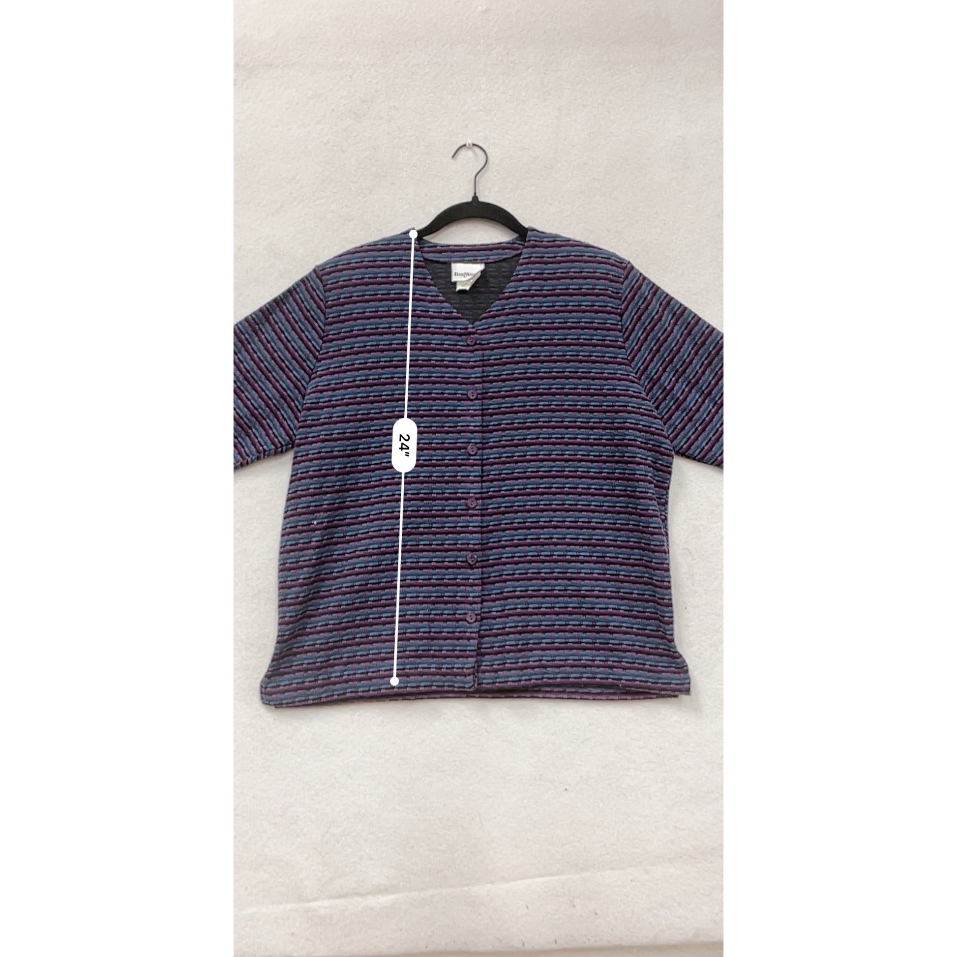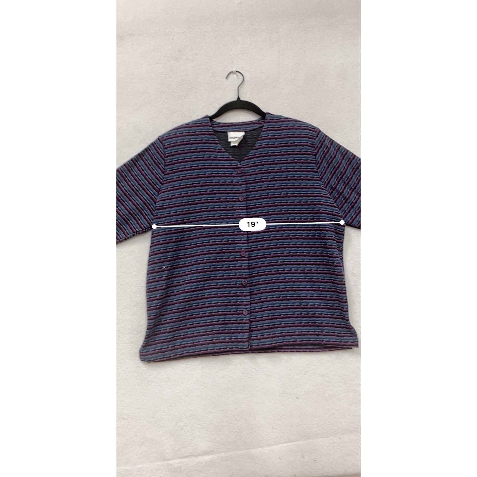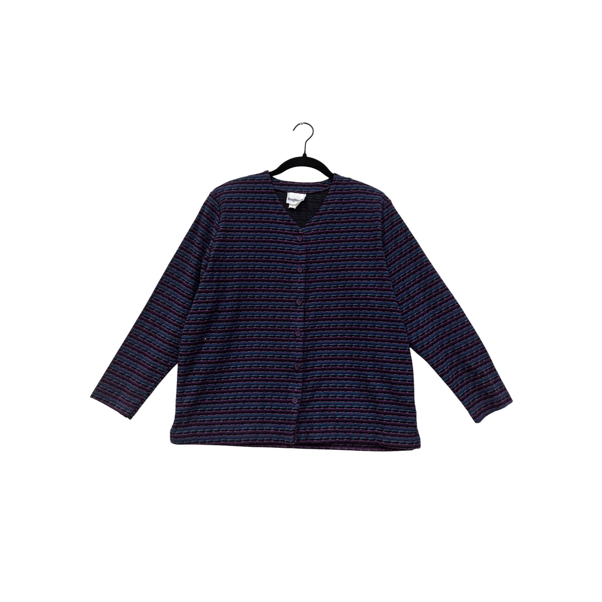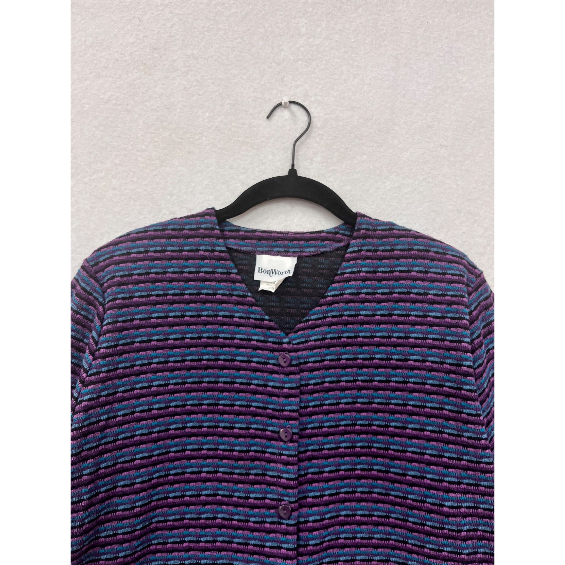 This BonWorth cardigan offers a polished yet cozy style. Its striped design combines purple and black hues, suitable for both casual and professional settings.