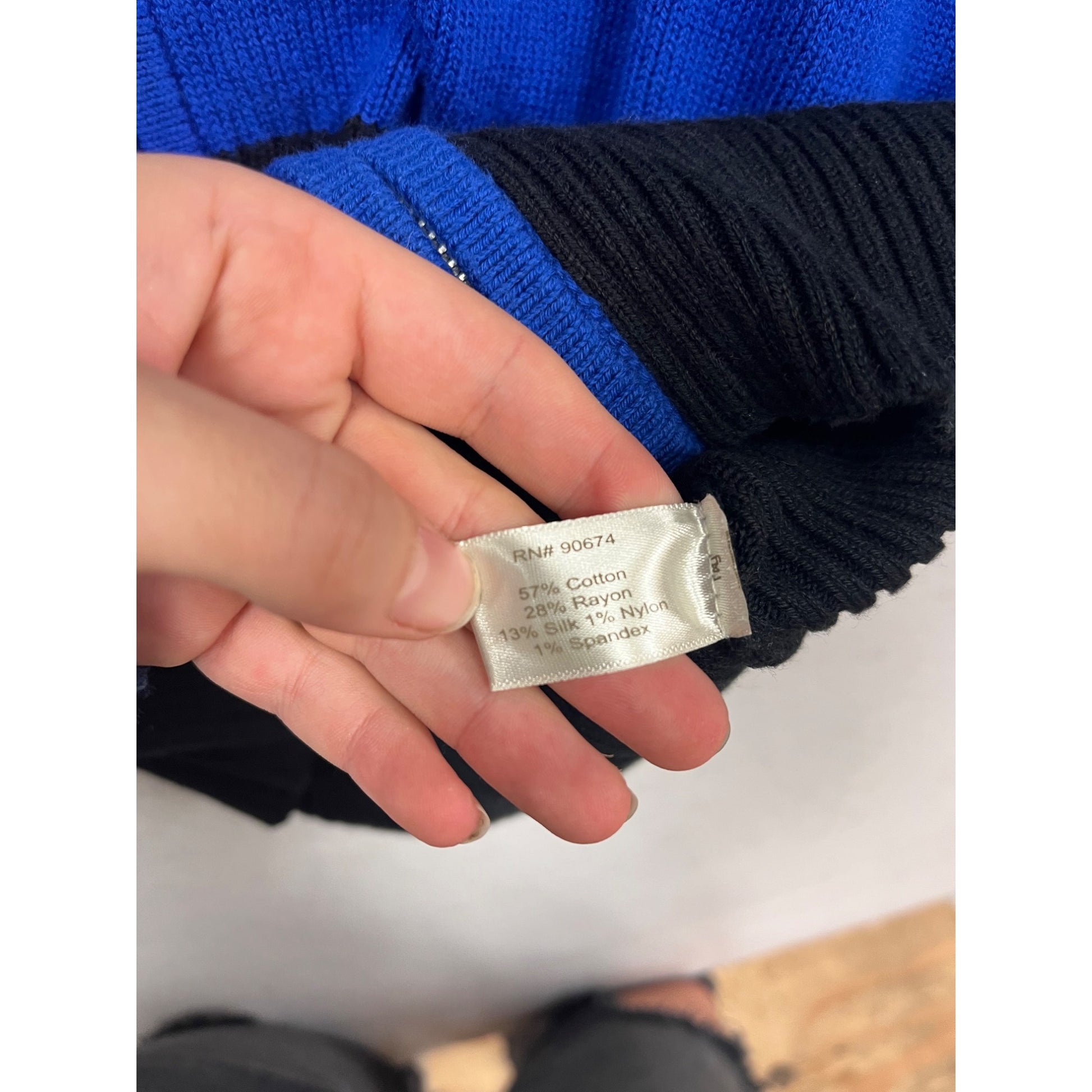 This Boston Proper sweater features a versatile full-zip design complemented by a striking blue and black color scheme. Crafted from a cotton and rayon blend, it offers warmth and comfort, suitable for various settings. The unique collar adds a touch of elegance, making it an excellent addition to any wardrobe.