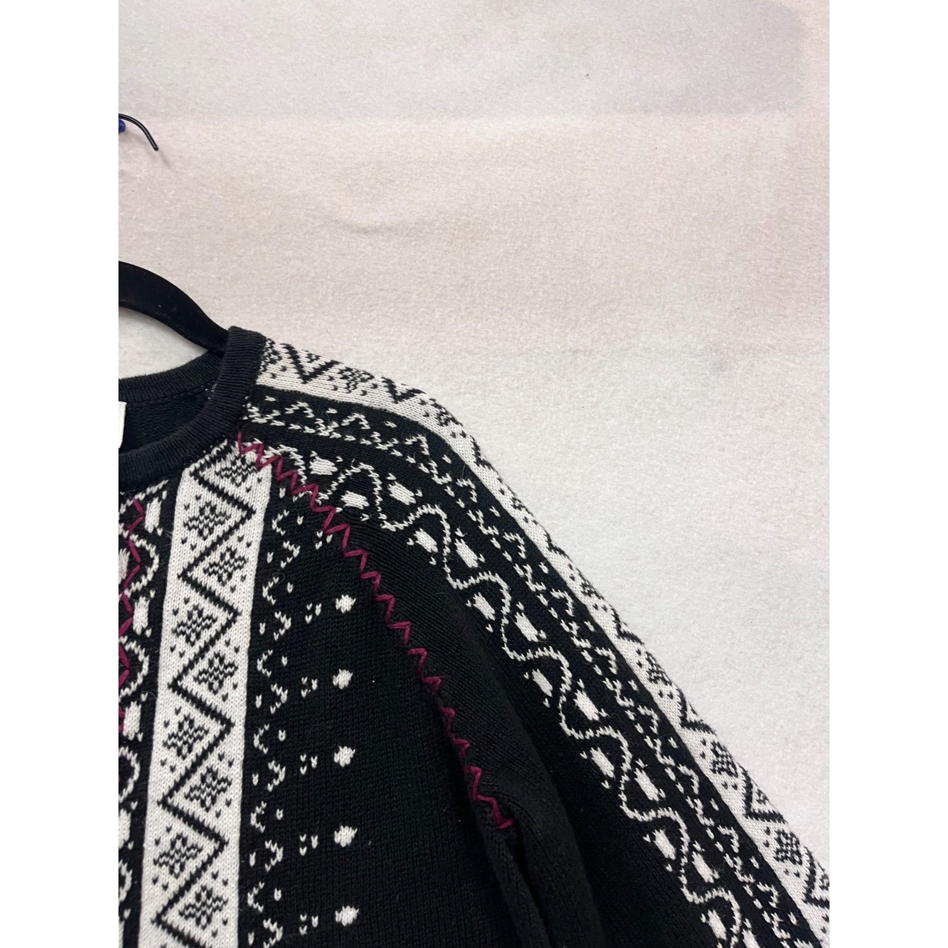 This Breckenridge Nordic-style sweater exudes a vintage charm with its intricate snowflake pattern and rich embroidery. A timeless piece for chilly days.
