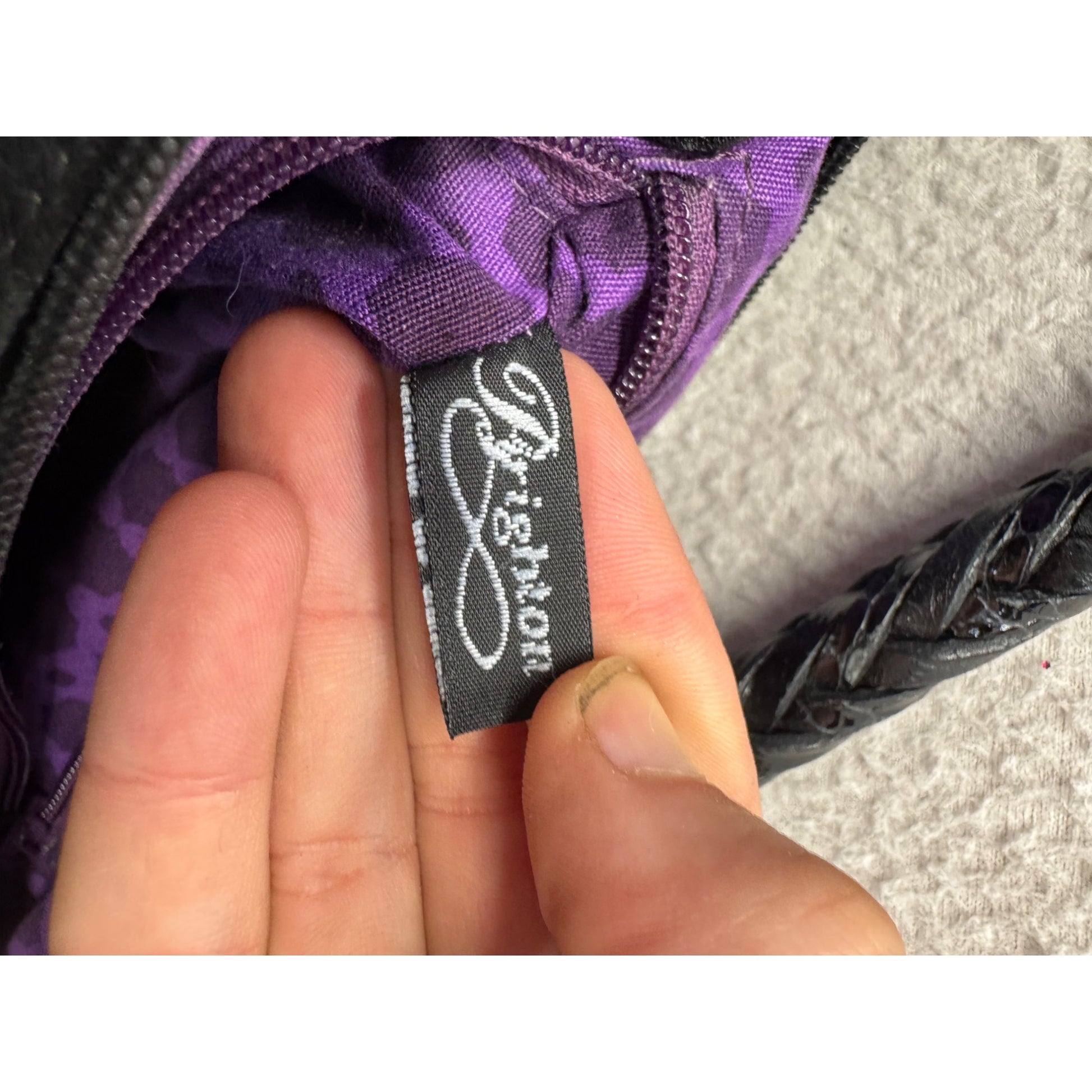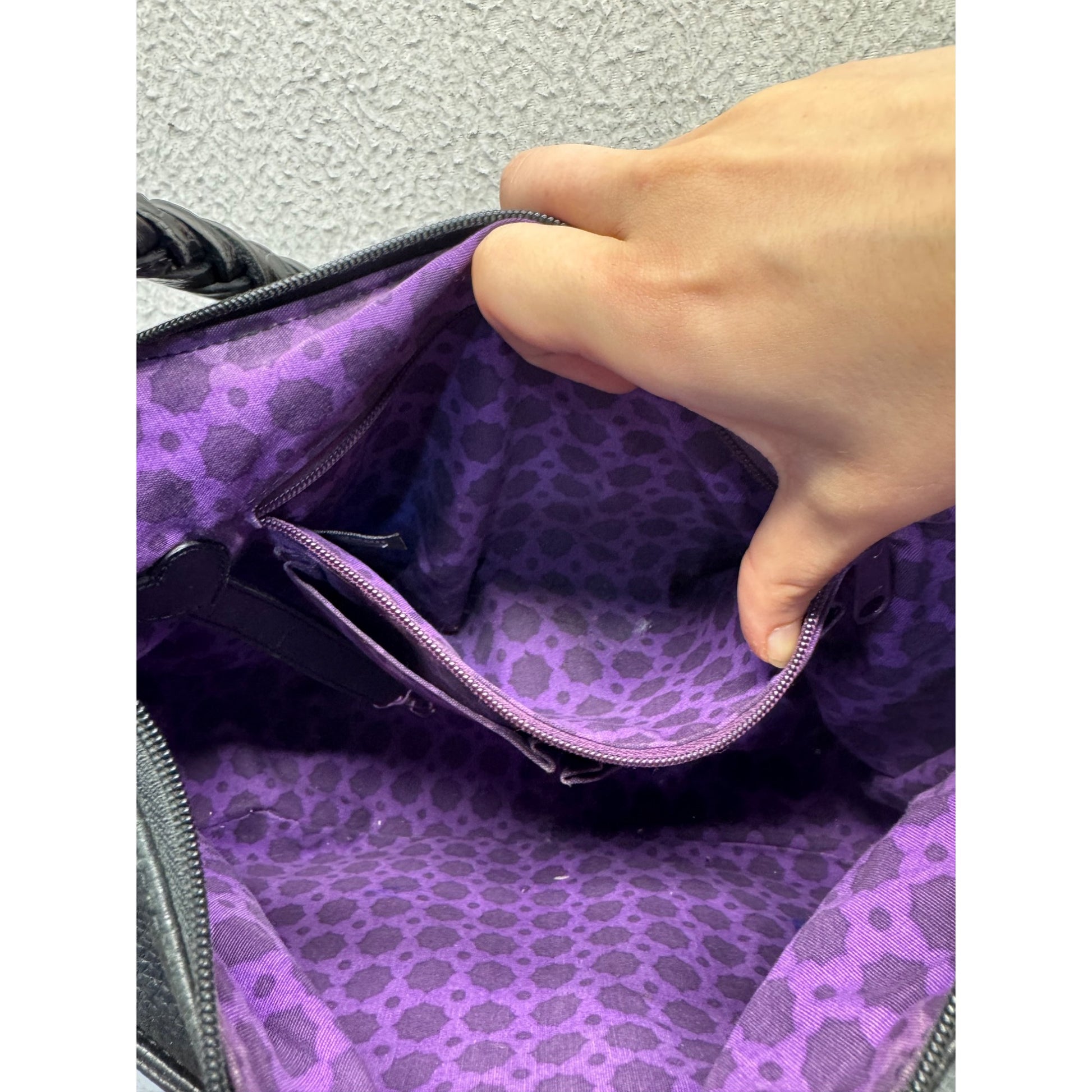 This Tignanello shoulder bag features pebbled leather, a braided strap, and an elegant heart charm. Its spacious interior includes vibrant purple lining for an added touch of sophistication.
