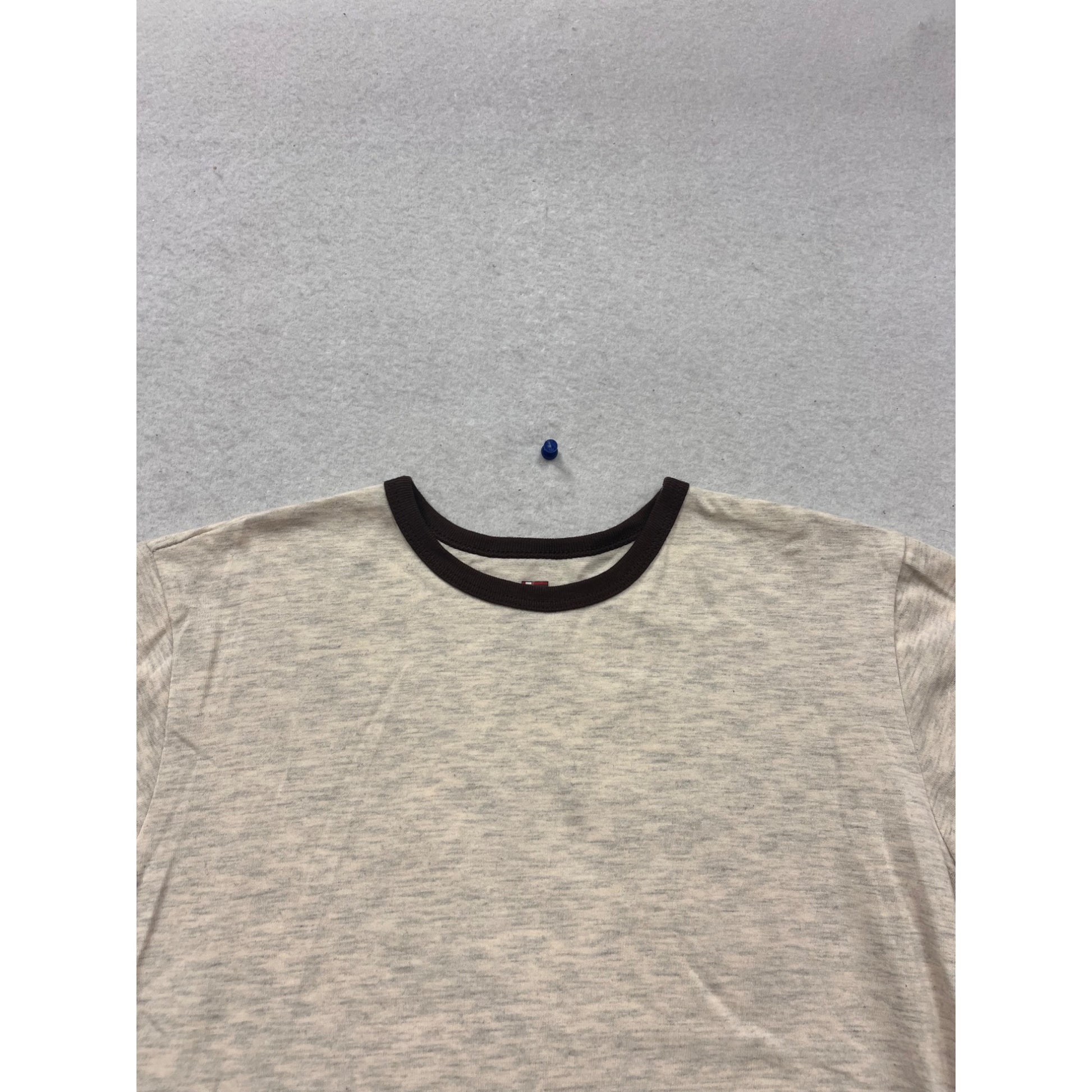 This Bugle Boy ringer t-shirt offers a classic style with its contrasting brown neckline and cuffs. Made from a cotton-polyester blend, it's designed for comfort and durability. Suitable for casual outings or daily wear.