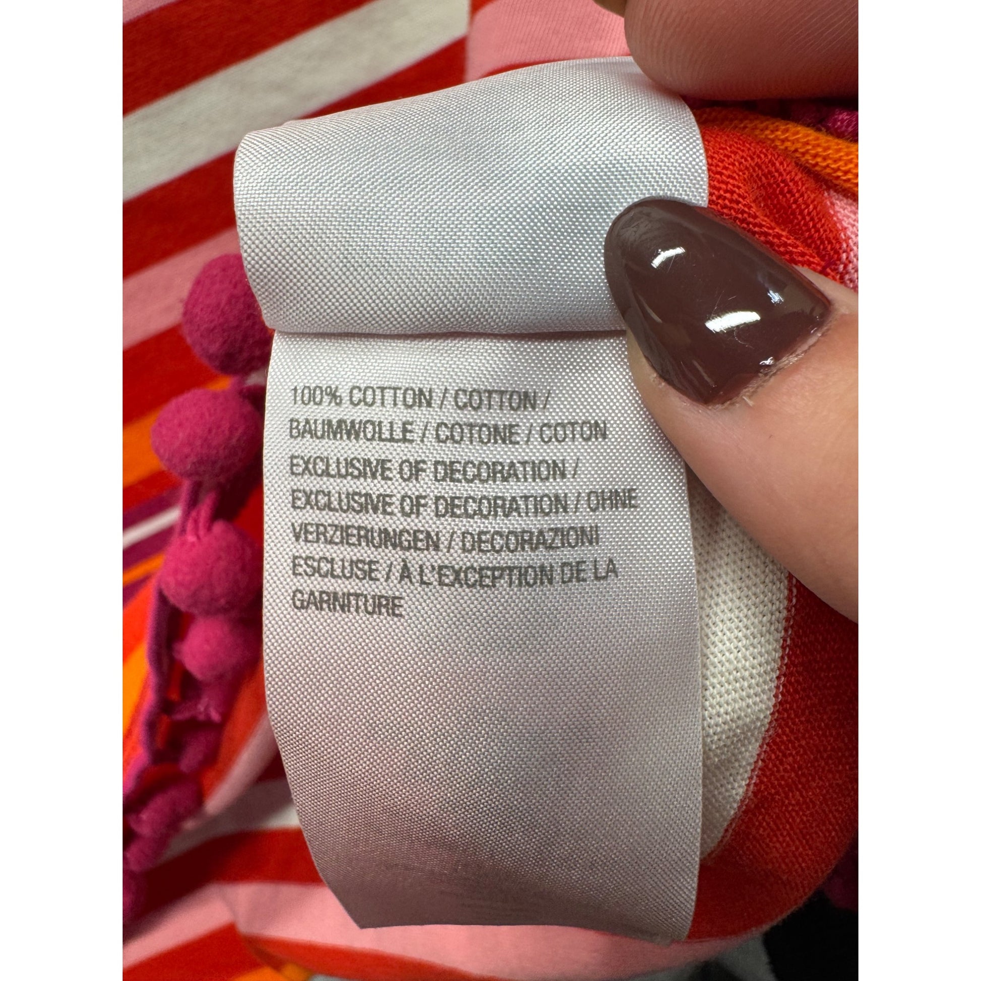This striped t-shirt combines vibrant colors with a playful pom pom hem detail. Made of 100% cotton, it is soft, breathable, and perfect for casual wear.