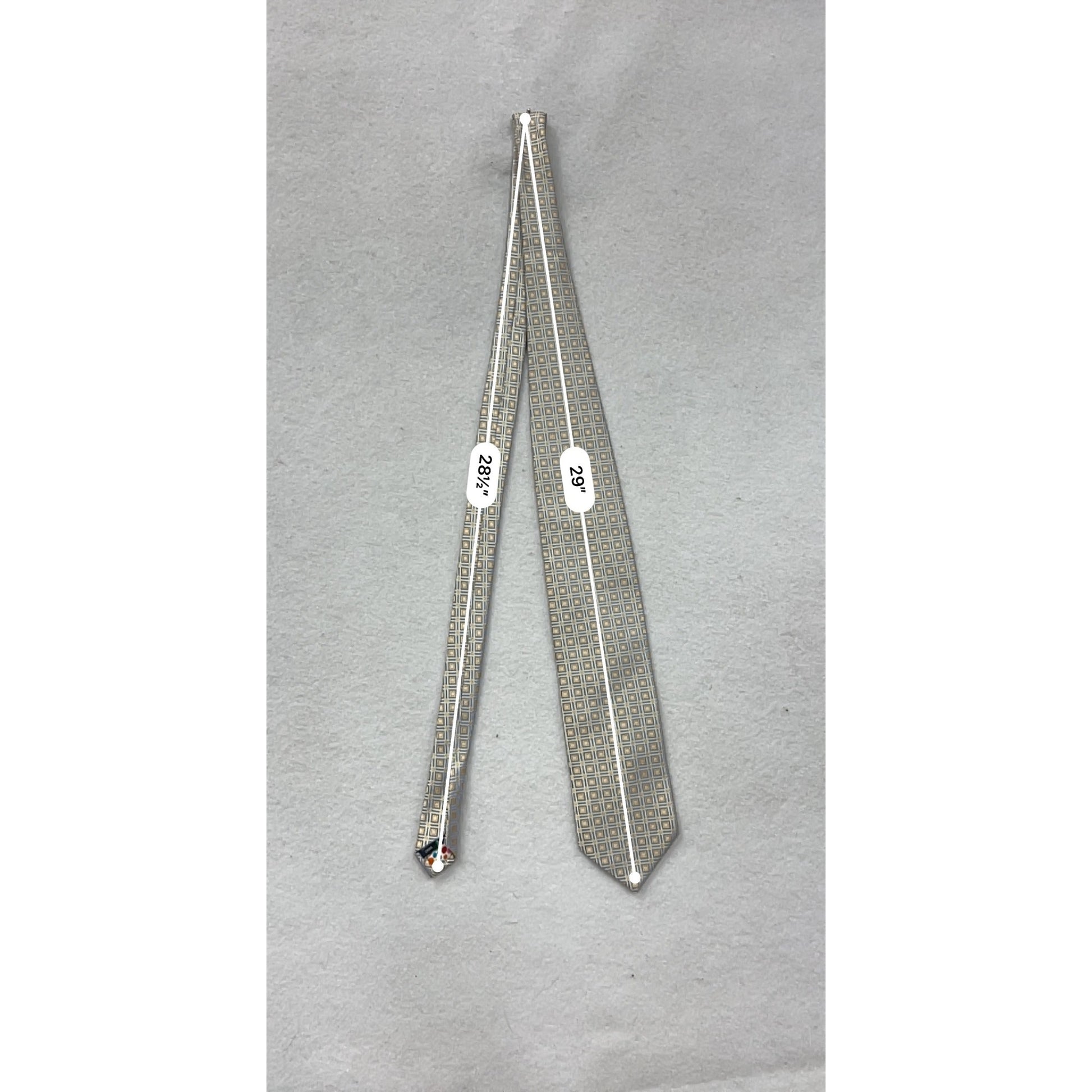 This silk tie features a subtle geometric pattern in gold and blue tones, adding a refined yet casual touch to any outfit.