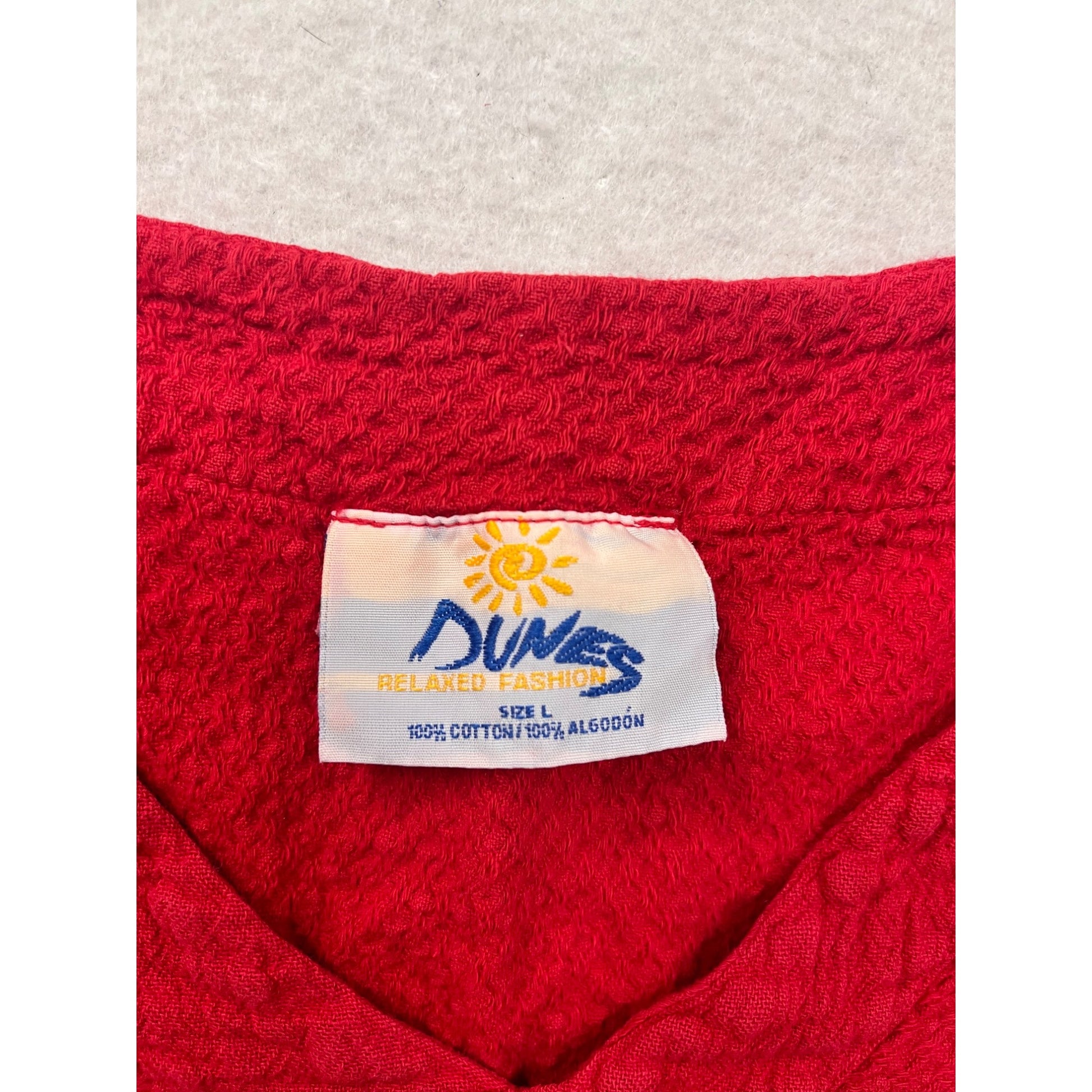 This relaxed-fit tunic top offers casual comfort with its textured cotton fabric and versatile V-neck design. Its vibrant red color adds a cheerful pop to your wardrobe.