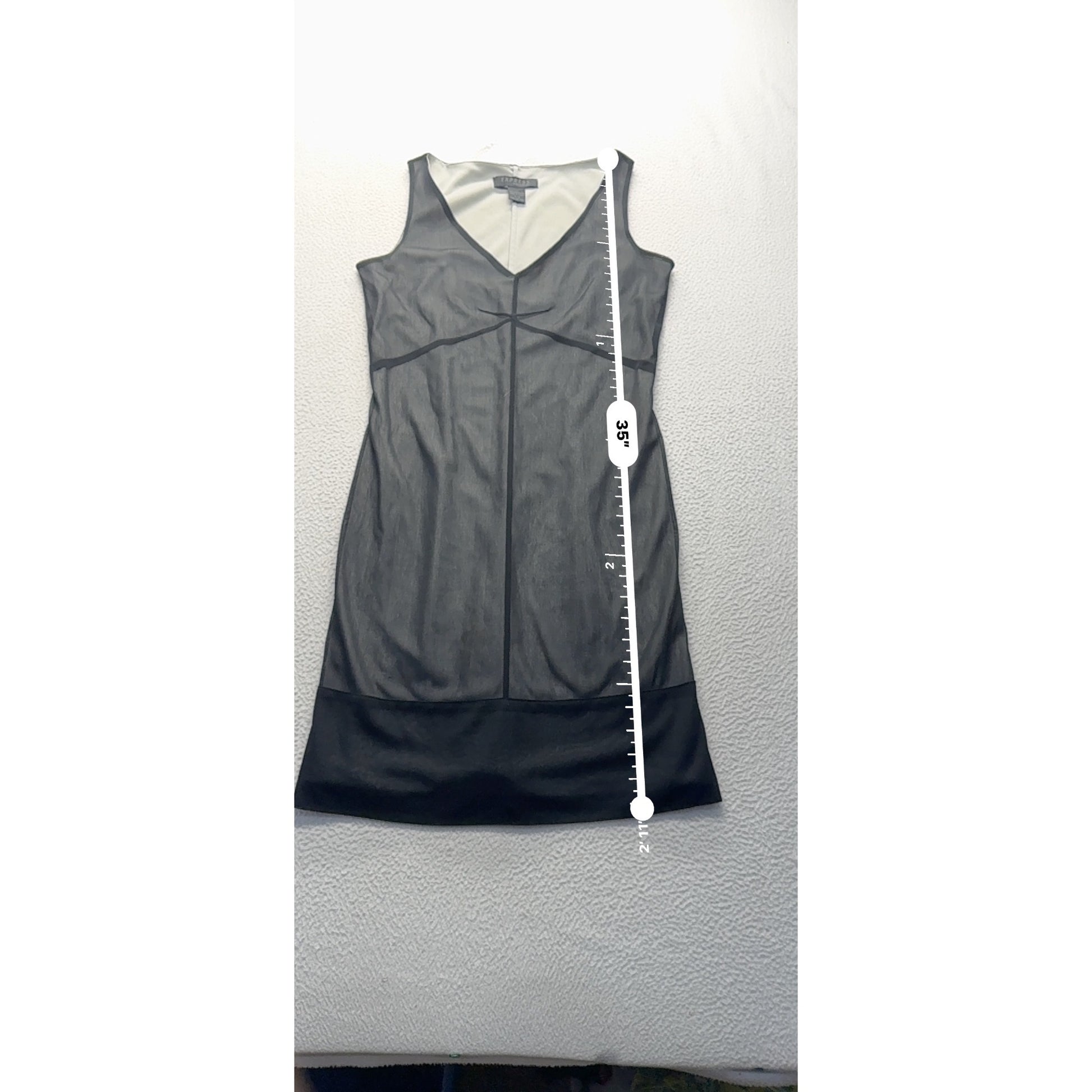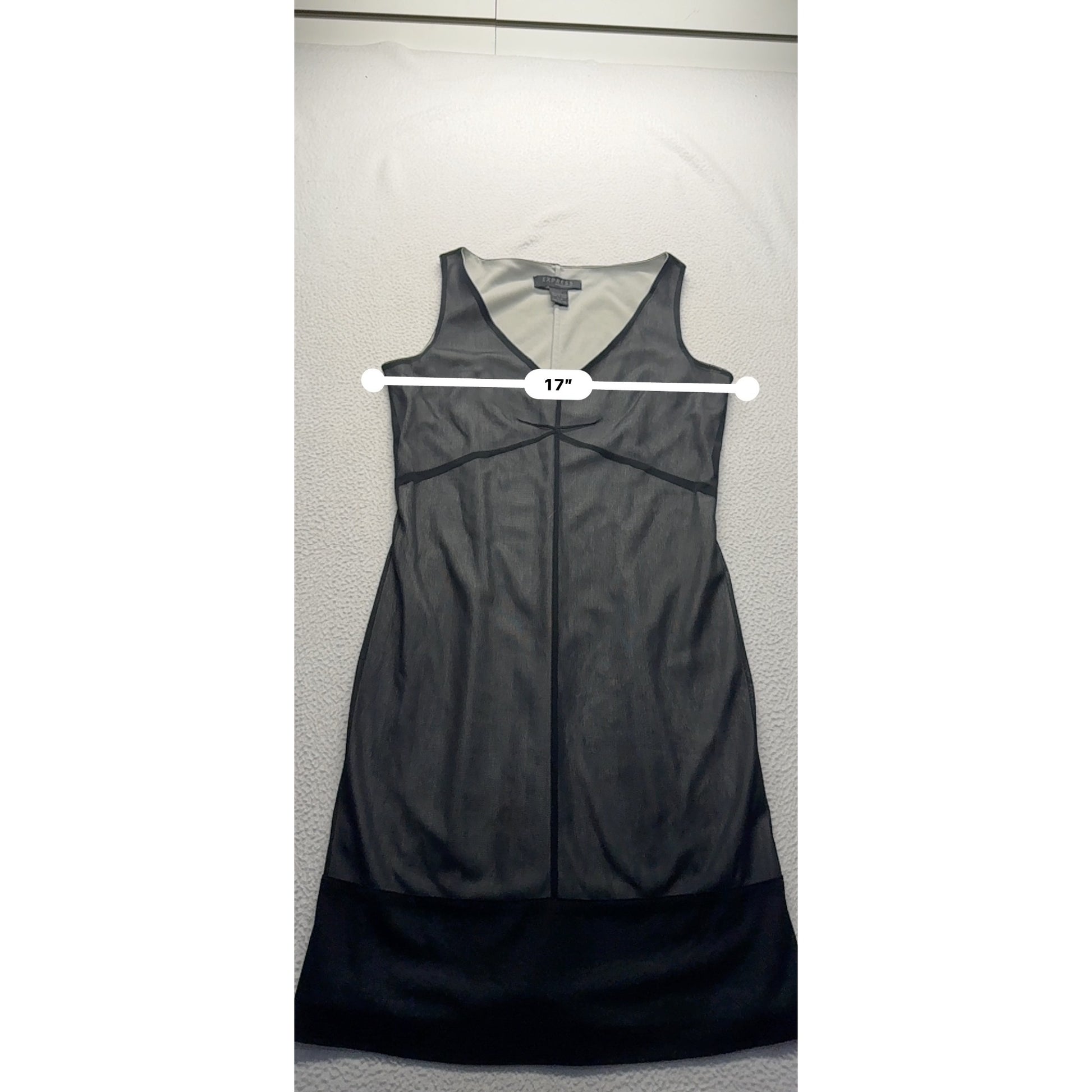 This sleeveless black dress by Express features a sheer mesh design with a polyester lining, providing a sophisticated and modern appearance. Its V-neckline and tailored fit ensure elegance for formal or professional settings.