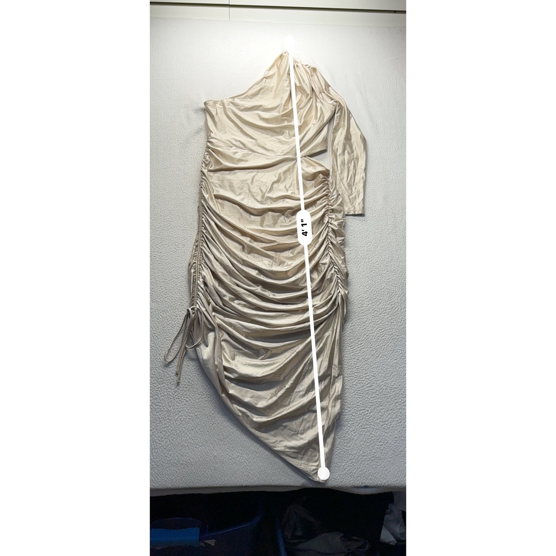 This elegant one-shoulder dress offers a sophisticated look with its ruched detailing and satin finish. The drawstring accent enhances its fit, making it suitable for formal events or evening gatherings. The dress's soft texture and luxurious feel provide comfort while maintaining a stylish appearance.