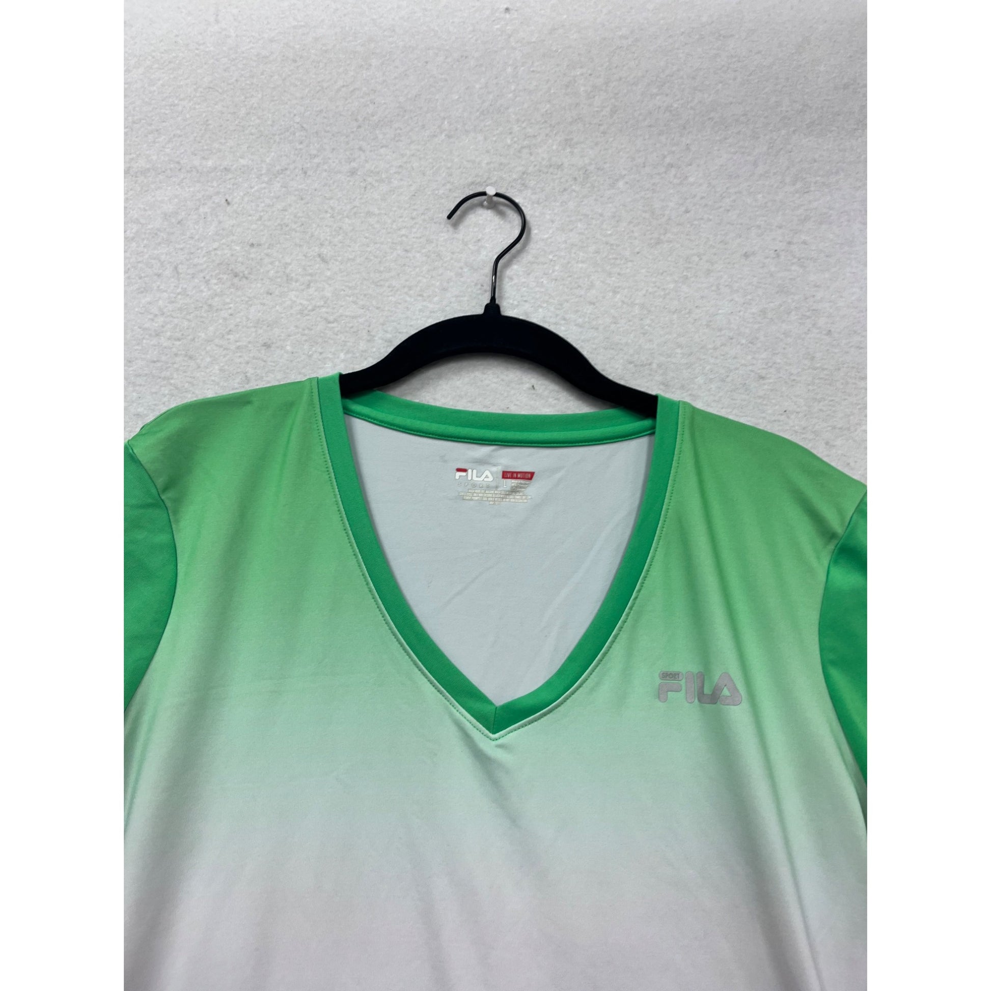Elevate your athletic wardrobe with this Fila women's ombre V-neck shirt. Featuring moisture-wicking fabric, it provides ultimate comfort during intense workouts. The gradient design adds a stylish touch, making it a versatile choice for gym sessions or casual outings. Designed with performance in mind, this tee ensures you stay cool and dry.