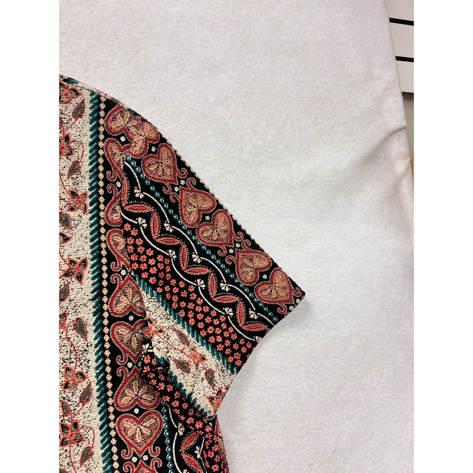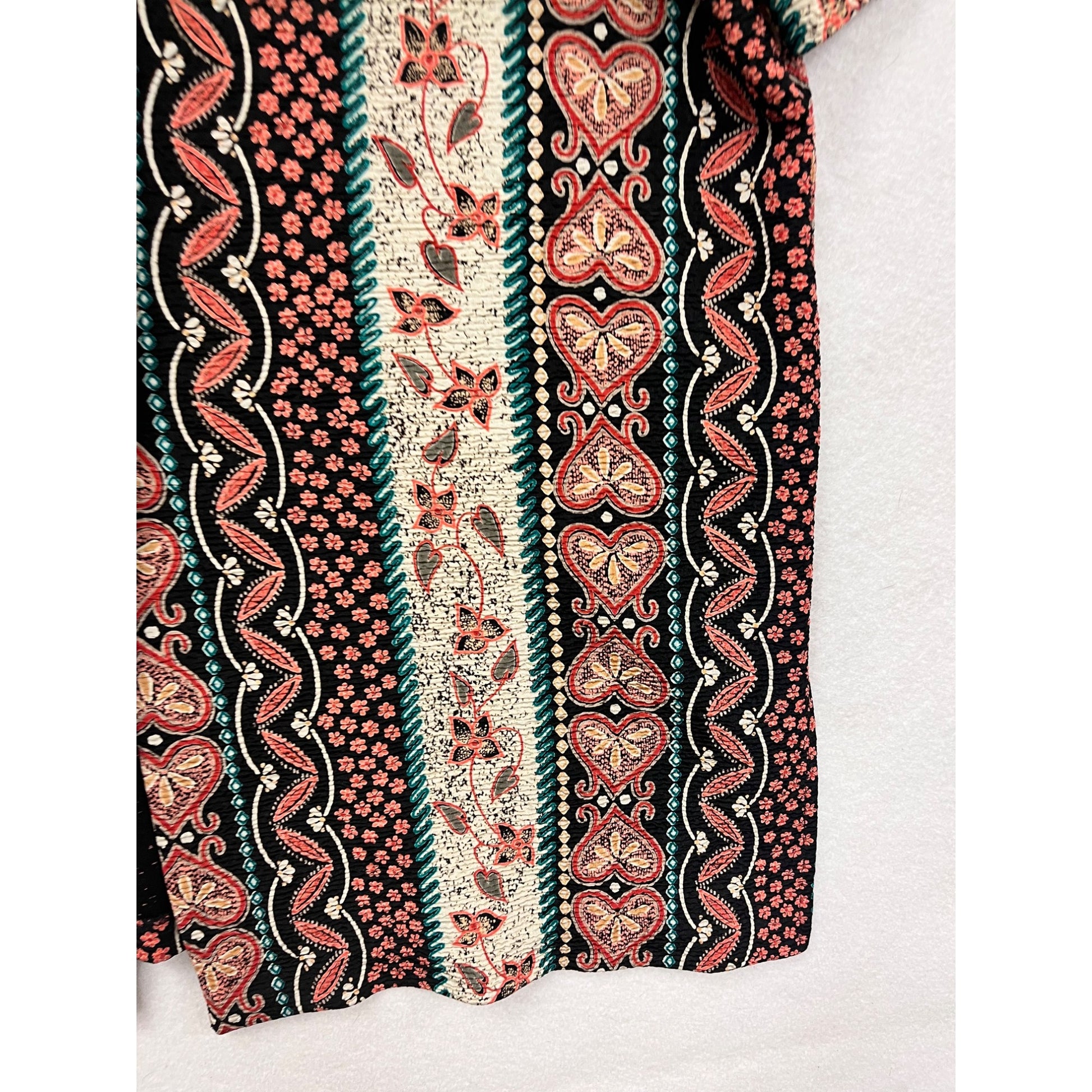This tunic top features a relaxed fit with a button-up front, short sleeves, and a bohemian-inspired striped and floral print. Made from 100% polyester for durability and easy maintenance.