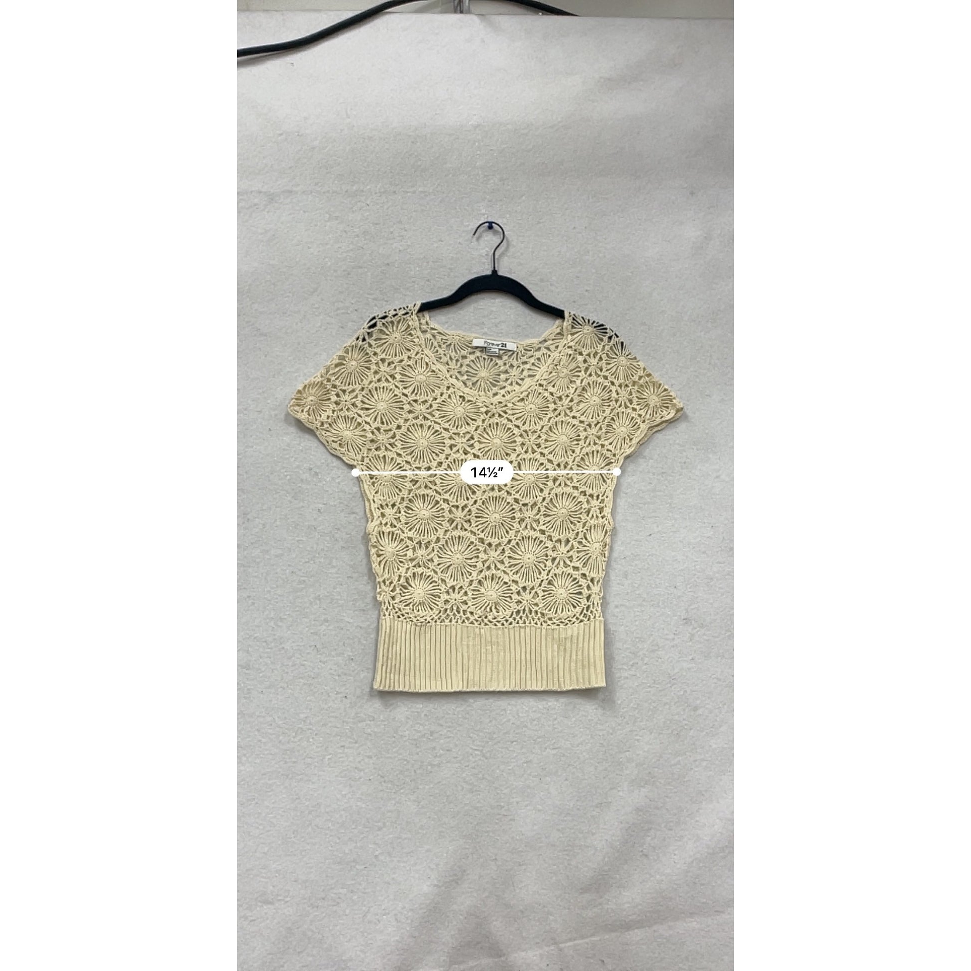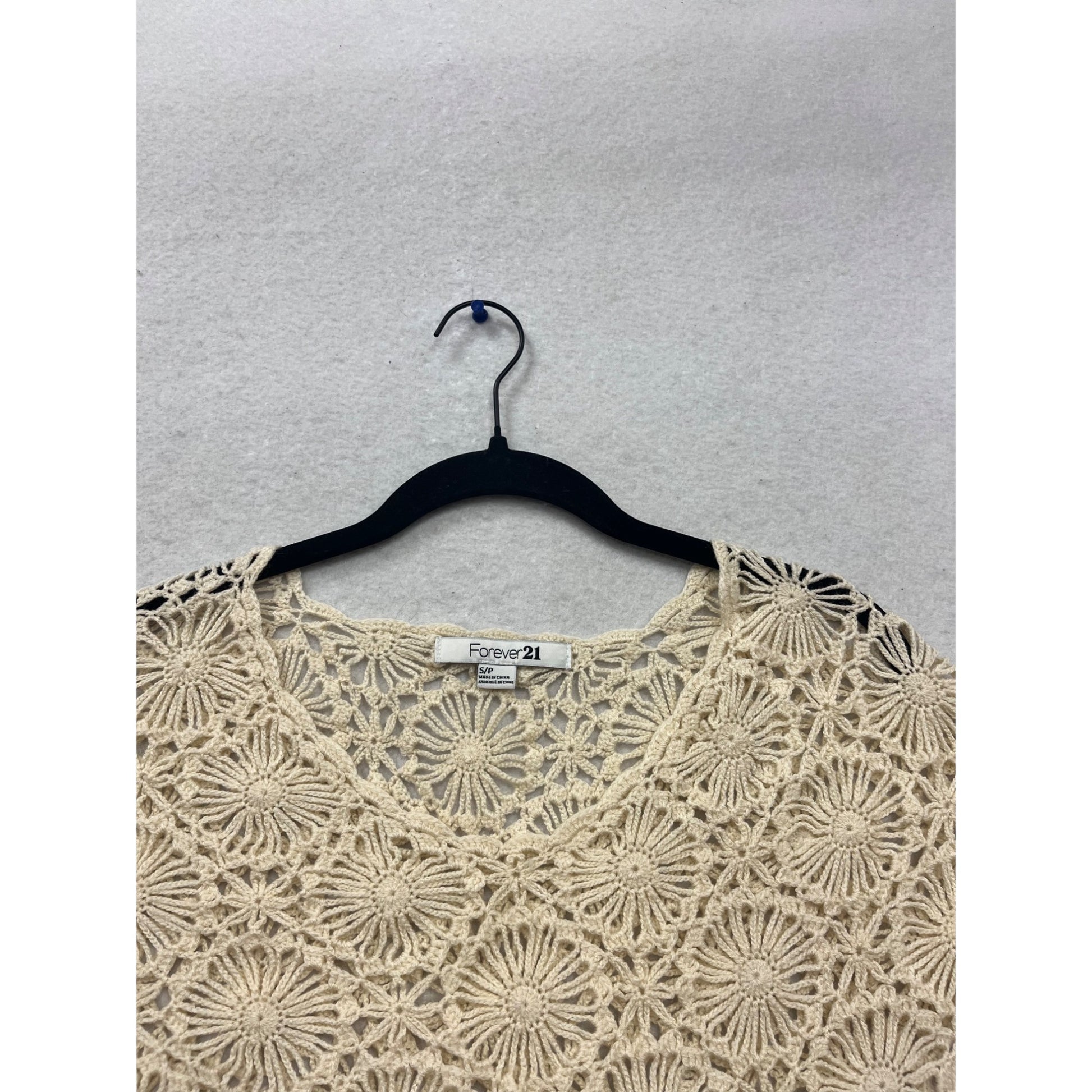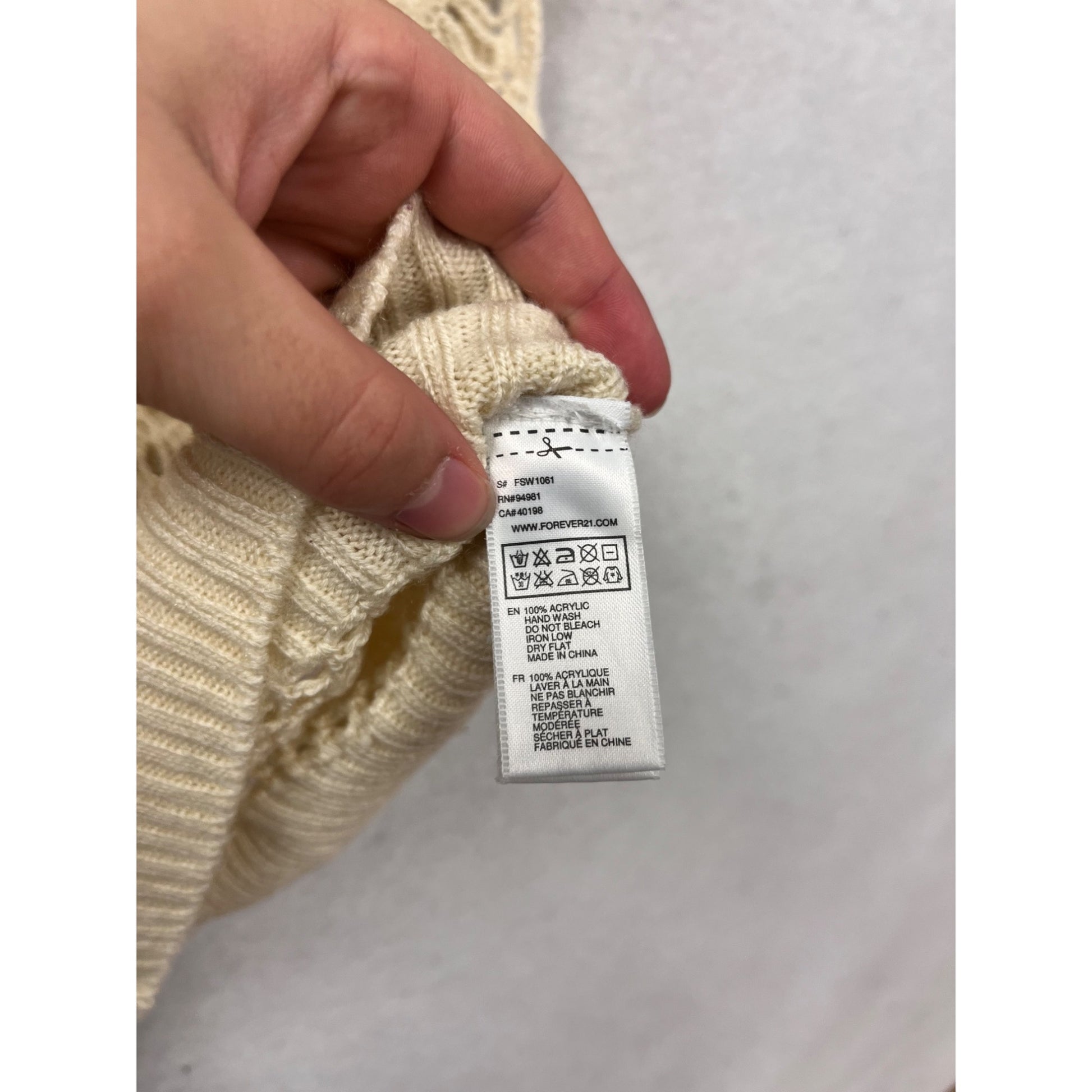 This Forever 21 crochet knit top offers a blend of style and comfort. Ideal for layering, its unique design provides a chic look for casual outings or relaxed occasions. The soft beige color complements various outfits, making it a versatile wardrobe addition.