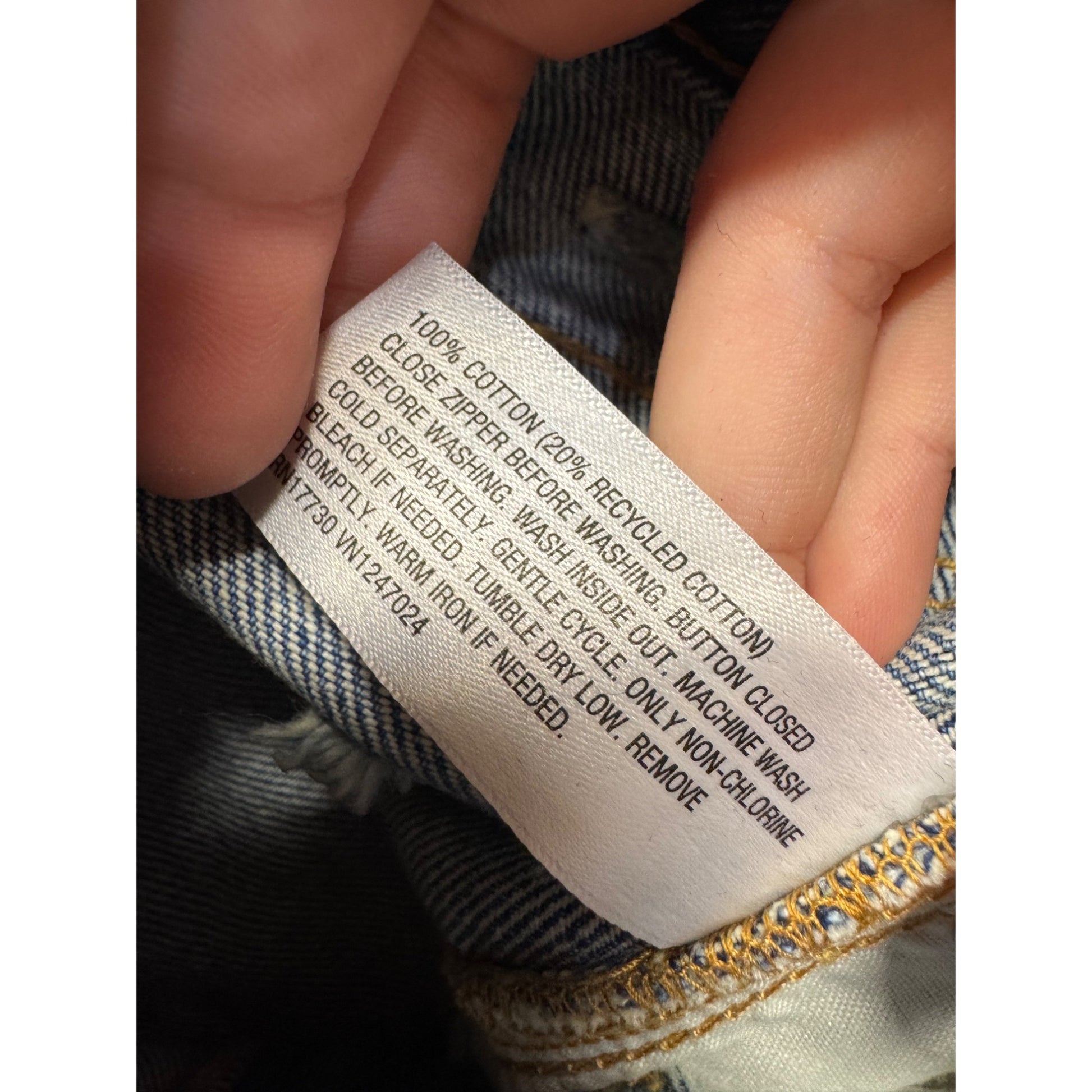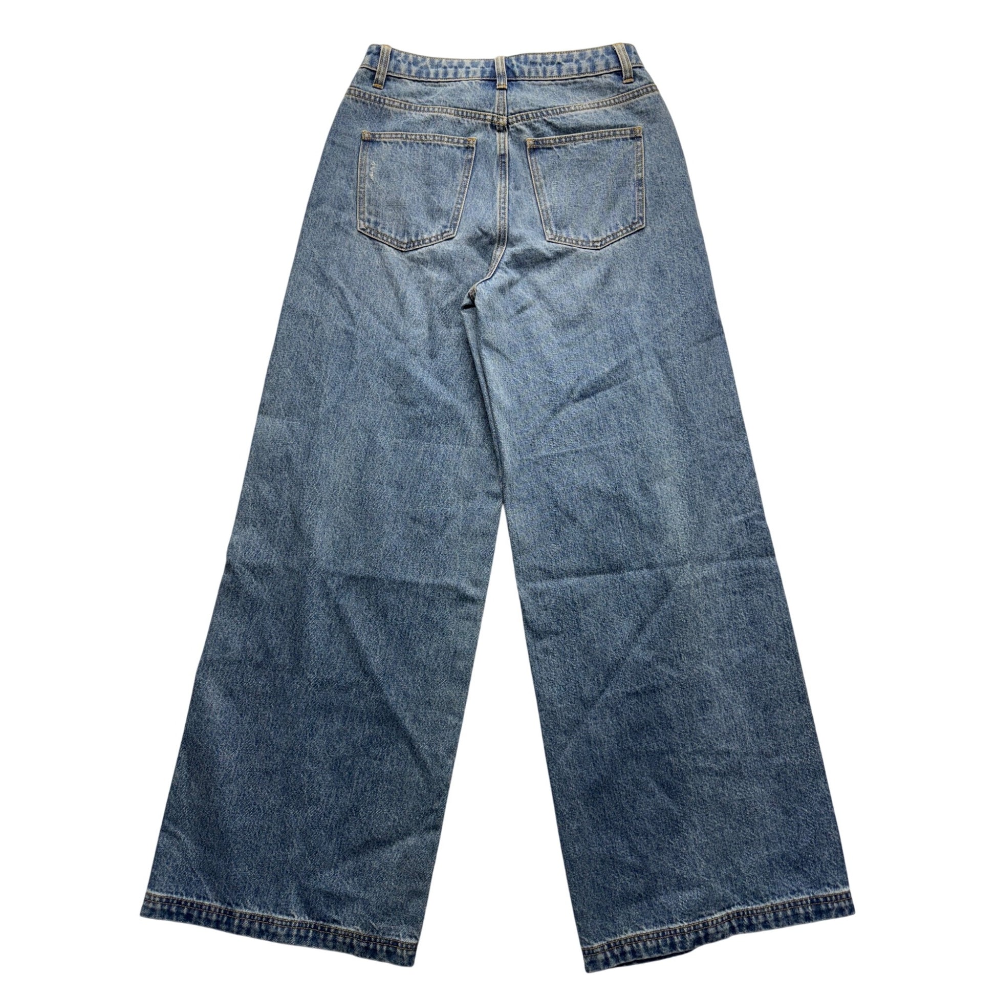 This wide-leg denim design offers a polished yet relaxed look, enhanced by distressed detailing for a modern aesthetic. Made with recycled cotton for sustainability.