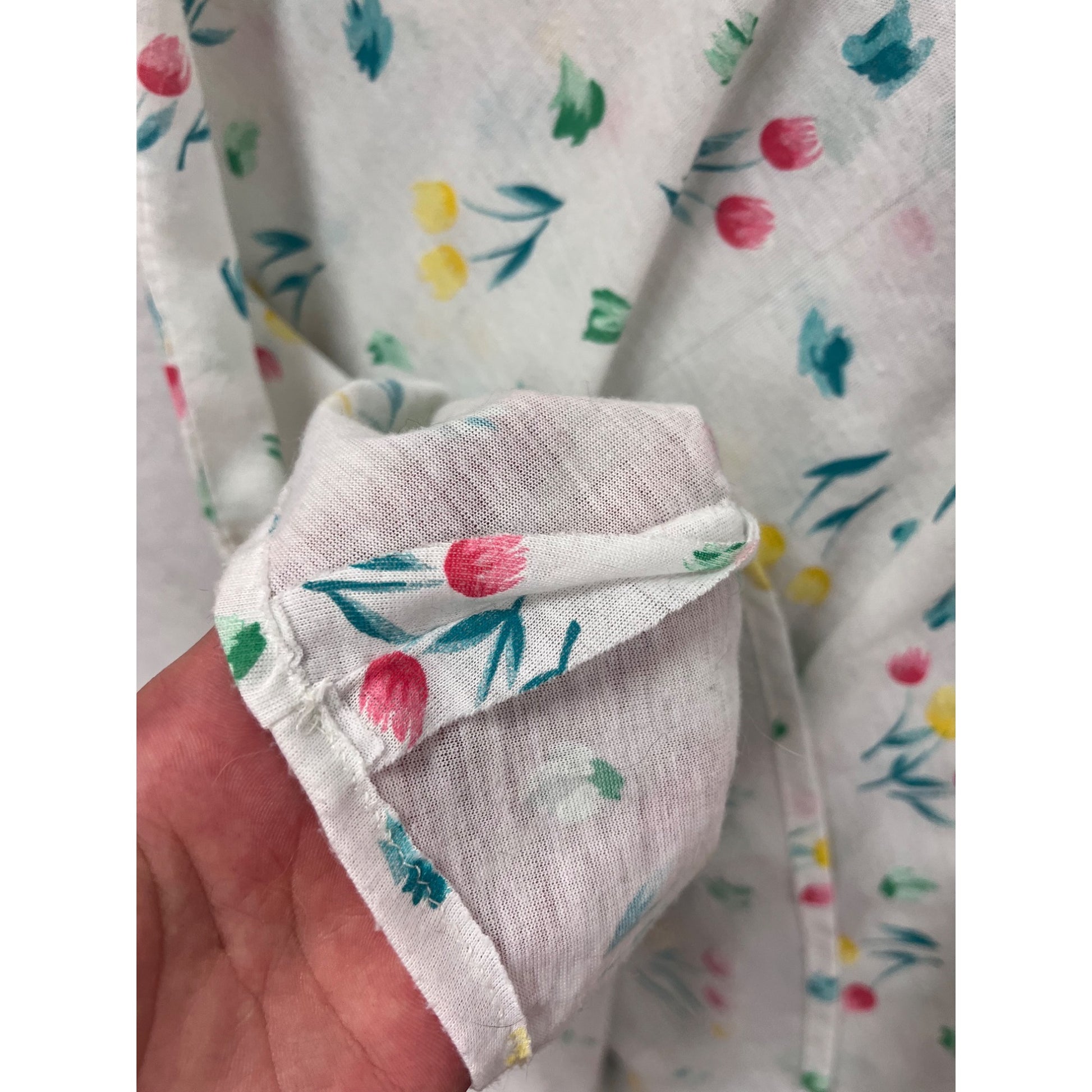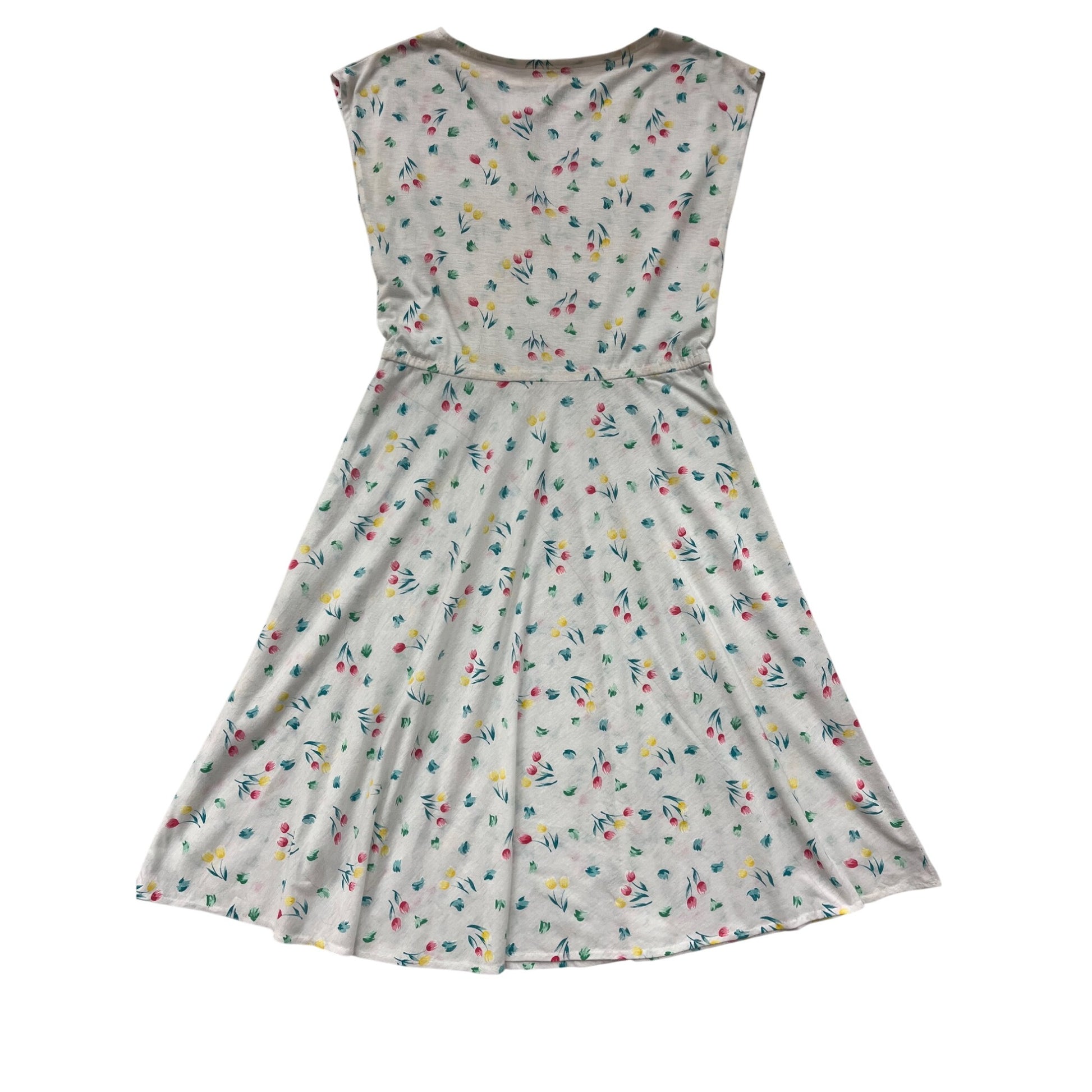 This handmade dress features a charming floral print on a soft white fabric, offering a lightweight and breathable option for stylish casual wear.