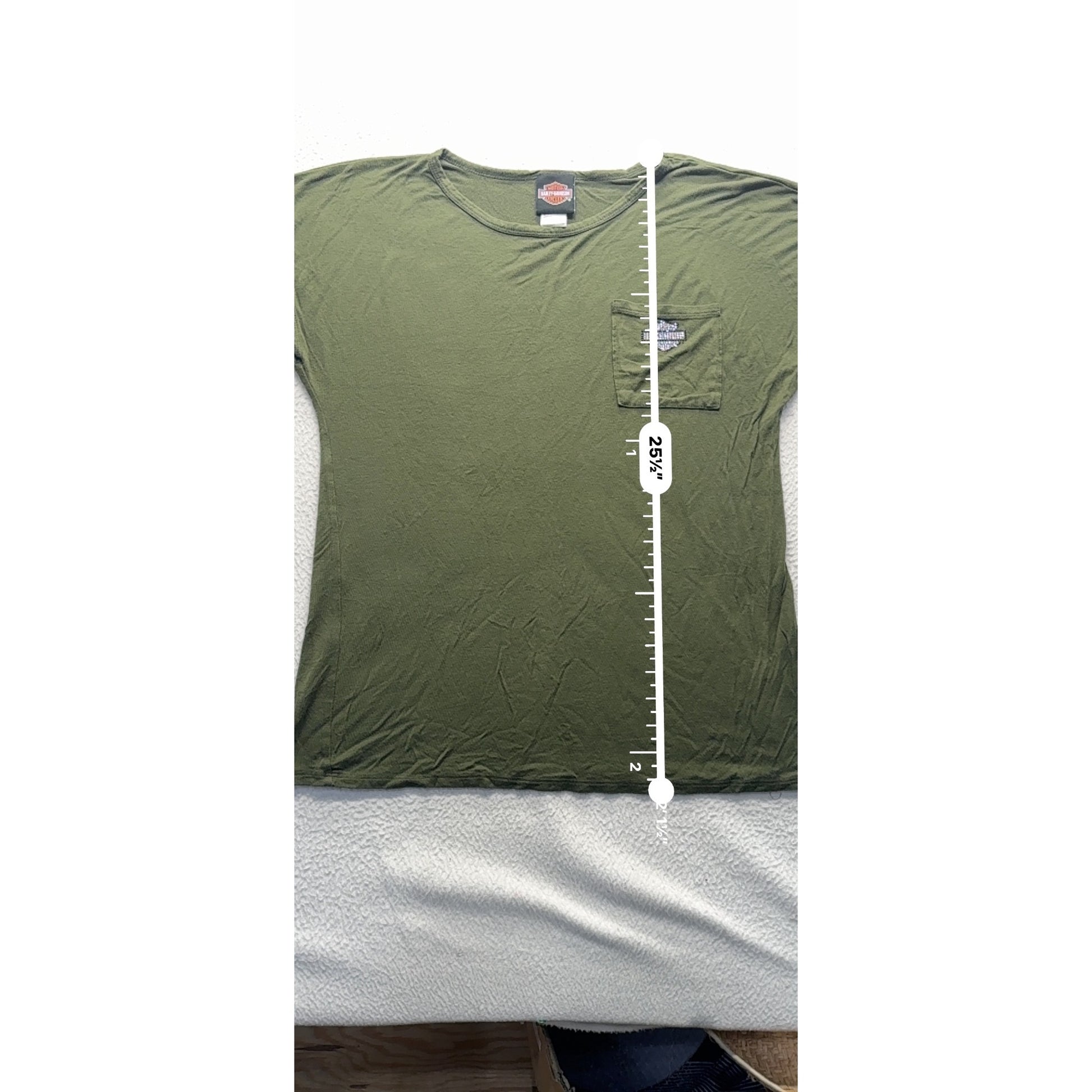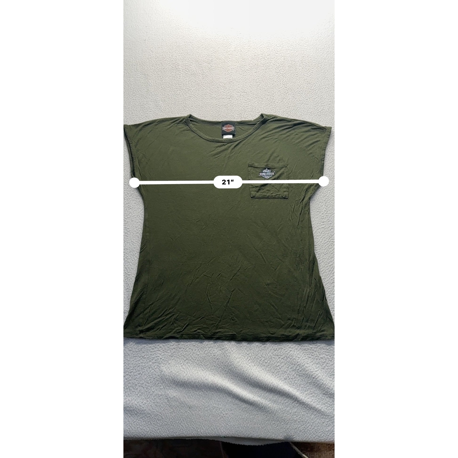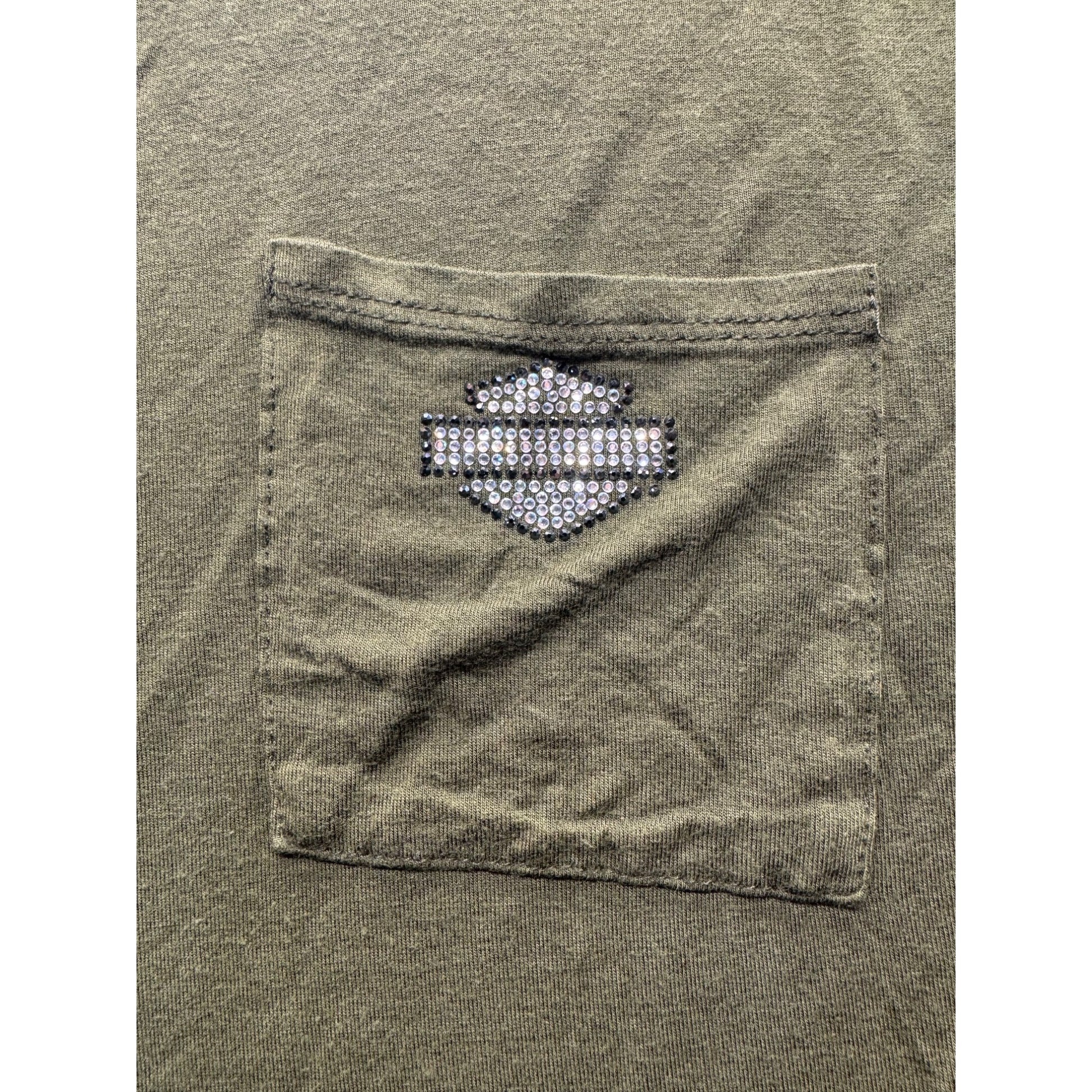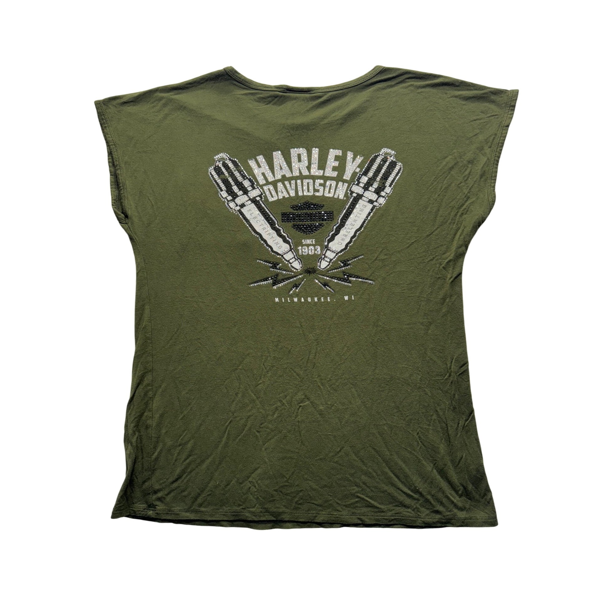 Harley-Davidson Olive Green Graphic Tee Rhinestone Spark Plug Design #9655
