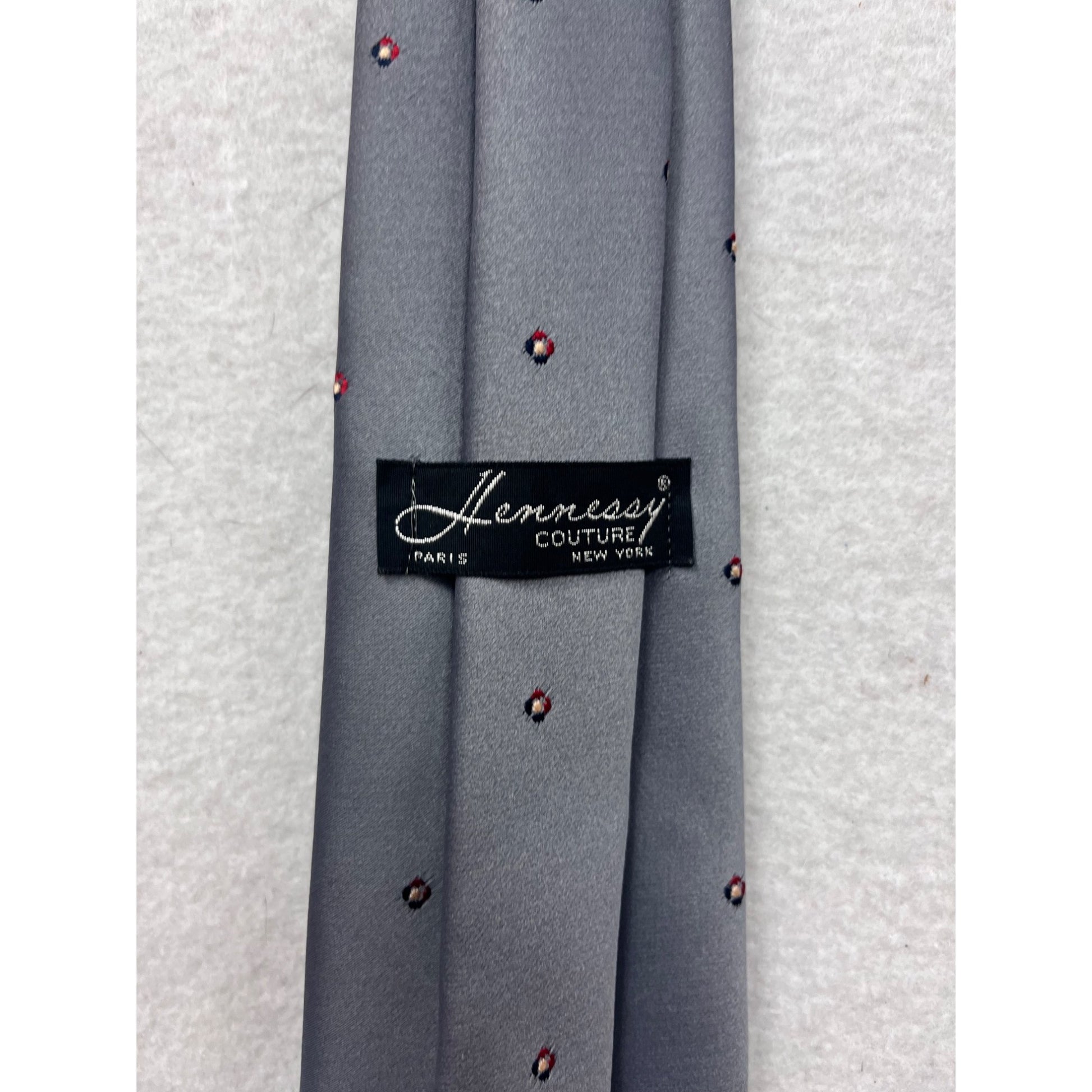 This Hennessy Couture necktie features a refined gray base with delicate red and white dot accents. Designed in a silk and polyester blend, it offers durability and sophistication for professional settings.