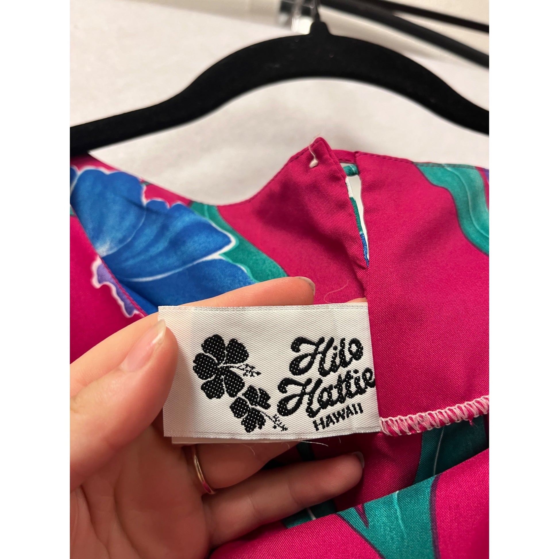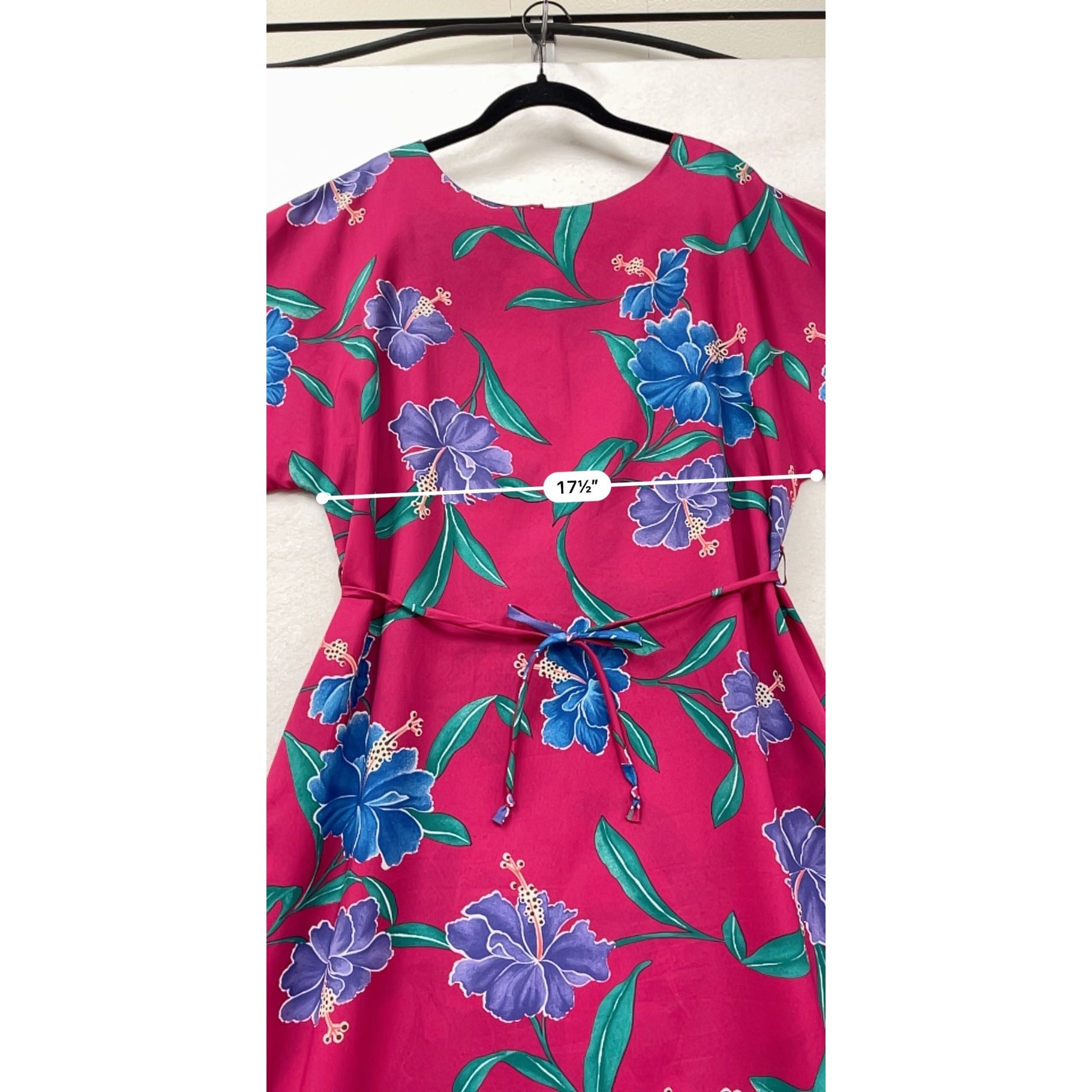 A charming vintage-inspired Hilo Hattie Hawaiian dress featuring a vibrant floral print. Lightweight polyester fabric with a flowing silhouette and tie waist detail.