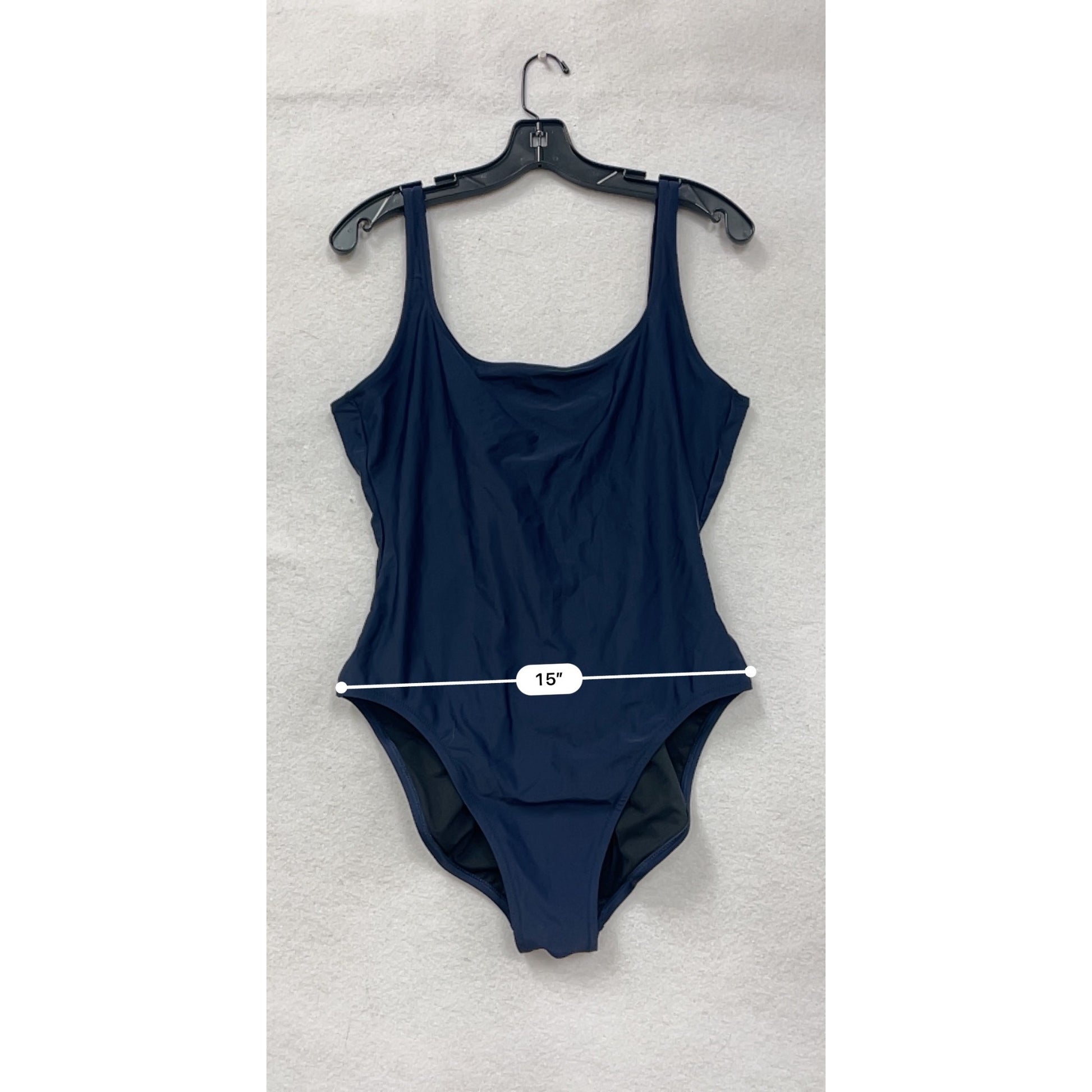This chic navy swimsuit features a flattering open back and scoop neckline. Made with a comfortable fabric blend, it's designed for both style and ease.