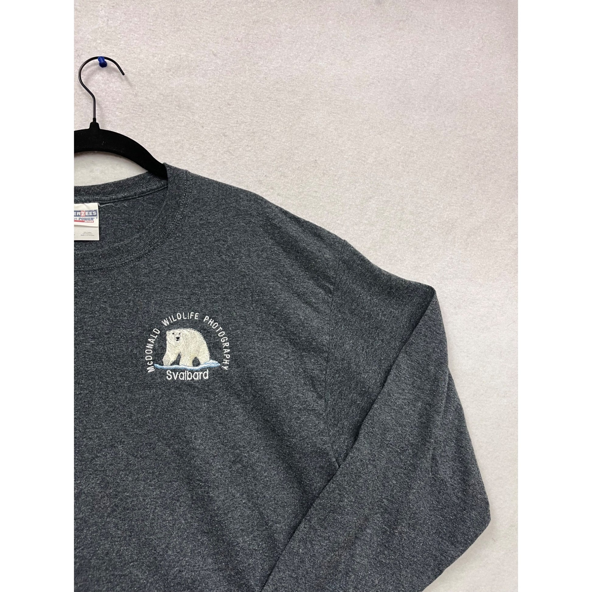 This Jerzees Dri-Power Active long sleeve T-shirt features a woodland wildlife photography Svalbard design. Made from a cotton blend, it offers comfort and durability, suitable for casual wear. The versatile gray color complements various styles. Ideal for wildlife enthusiasts or photographers seeking a casual yet purposeful piece for daily activities.