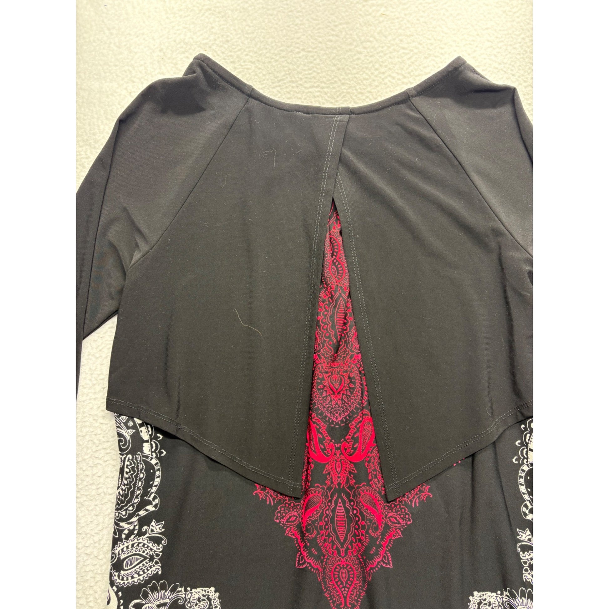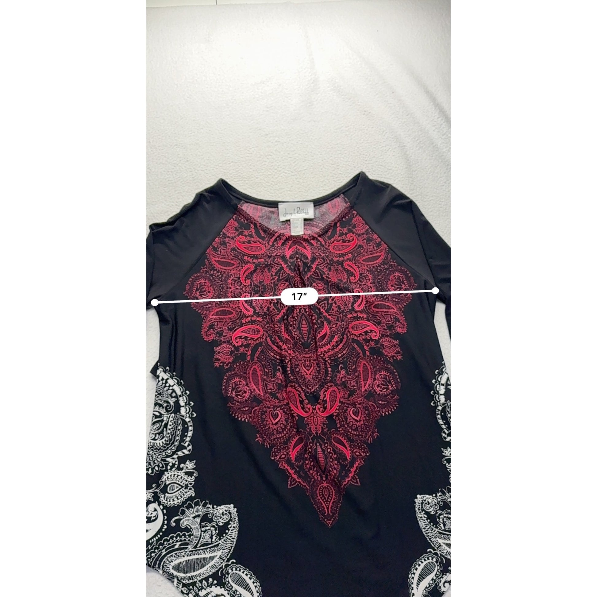 This stylish tunic top features a vibrant red and white paisley print on a black base, with a unique layered back detail. Comfortable and eye-catching.