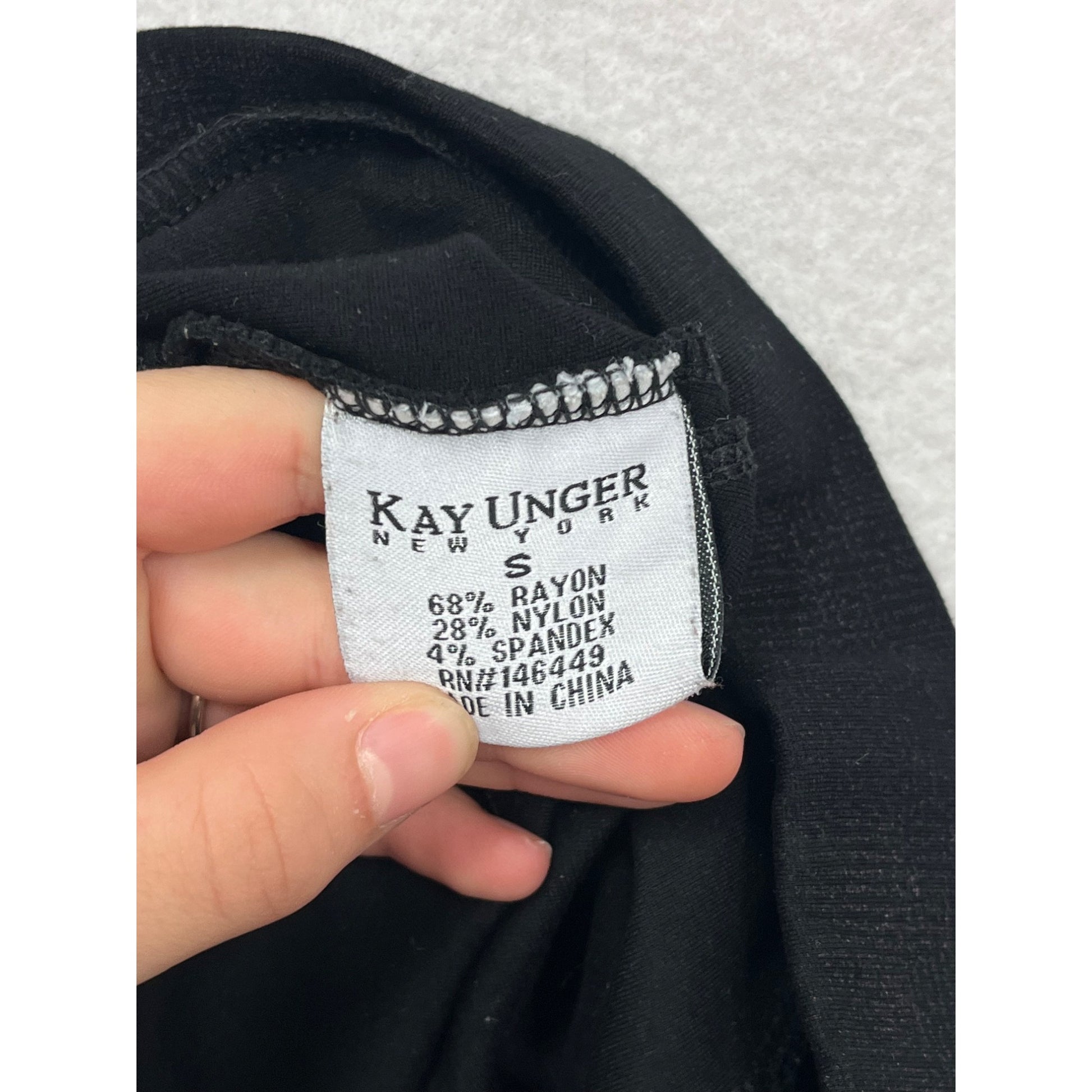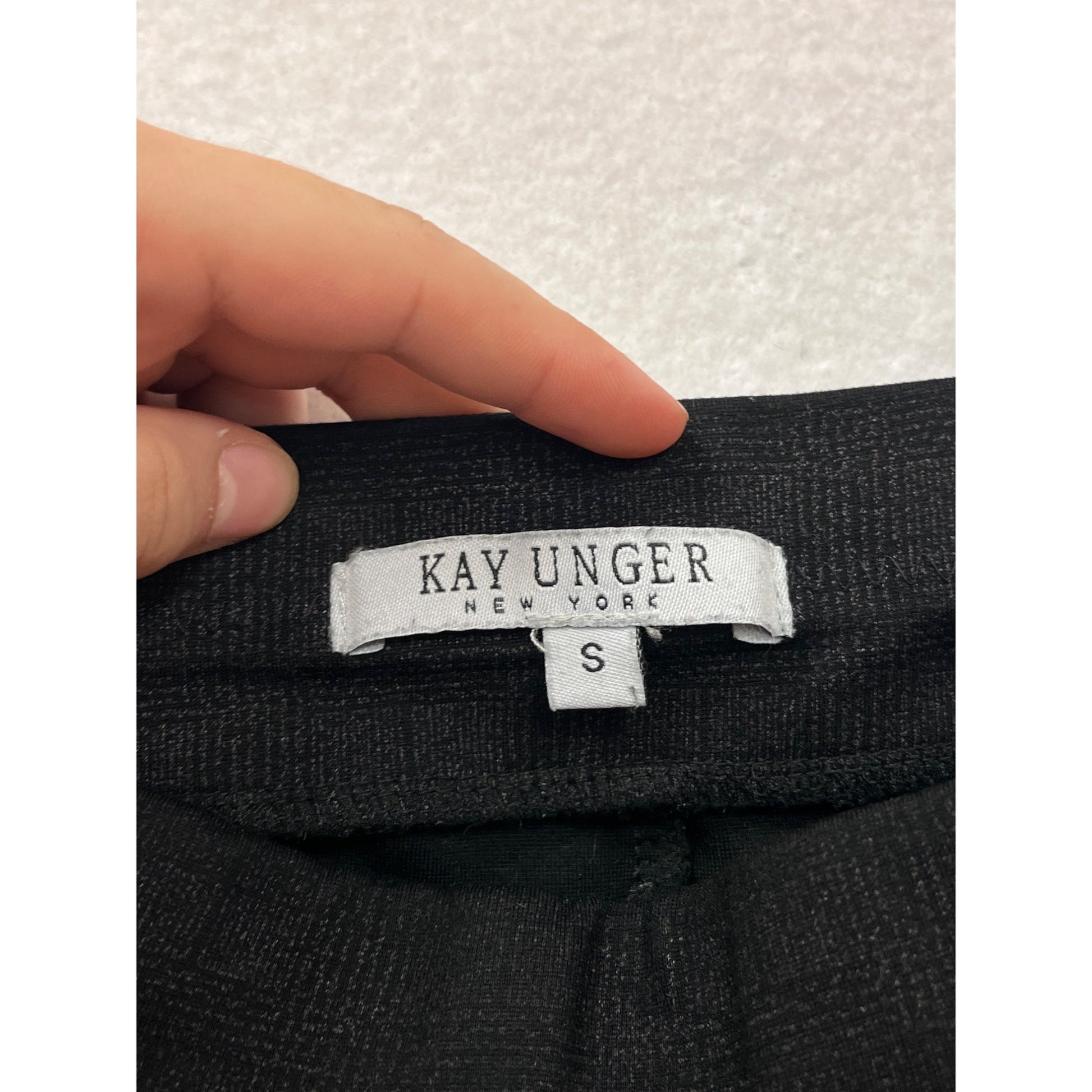 These slim-fit black pants from Kay Unger offer a sleek, professional appearance. Crafted from a rayon and nylon blend, they provide comfort and style for work or formal settings.