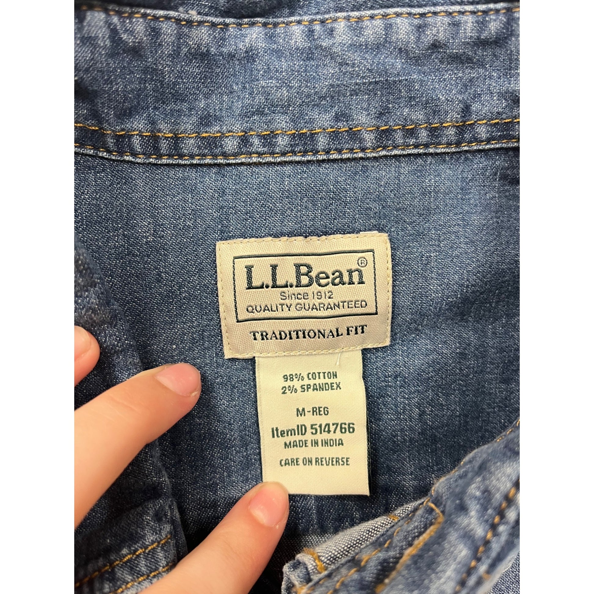 This L.L.Bean denim shirt is crafted for men with a traditional fit. Made from a blend of cotton and spandex, it offers comfort and stretch. Classic button-down design with dual chest pockets provides a timeless and versatile style suitable for various occasions.