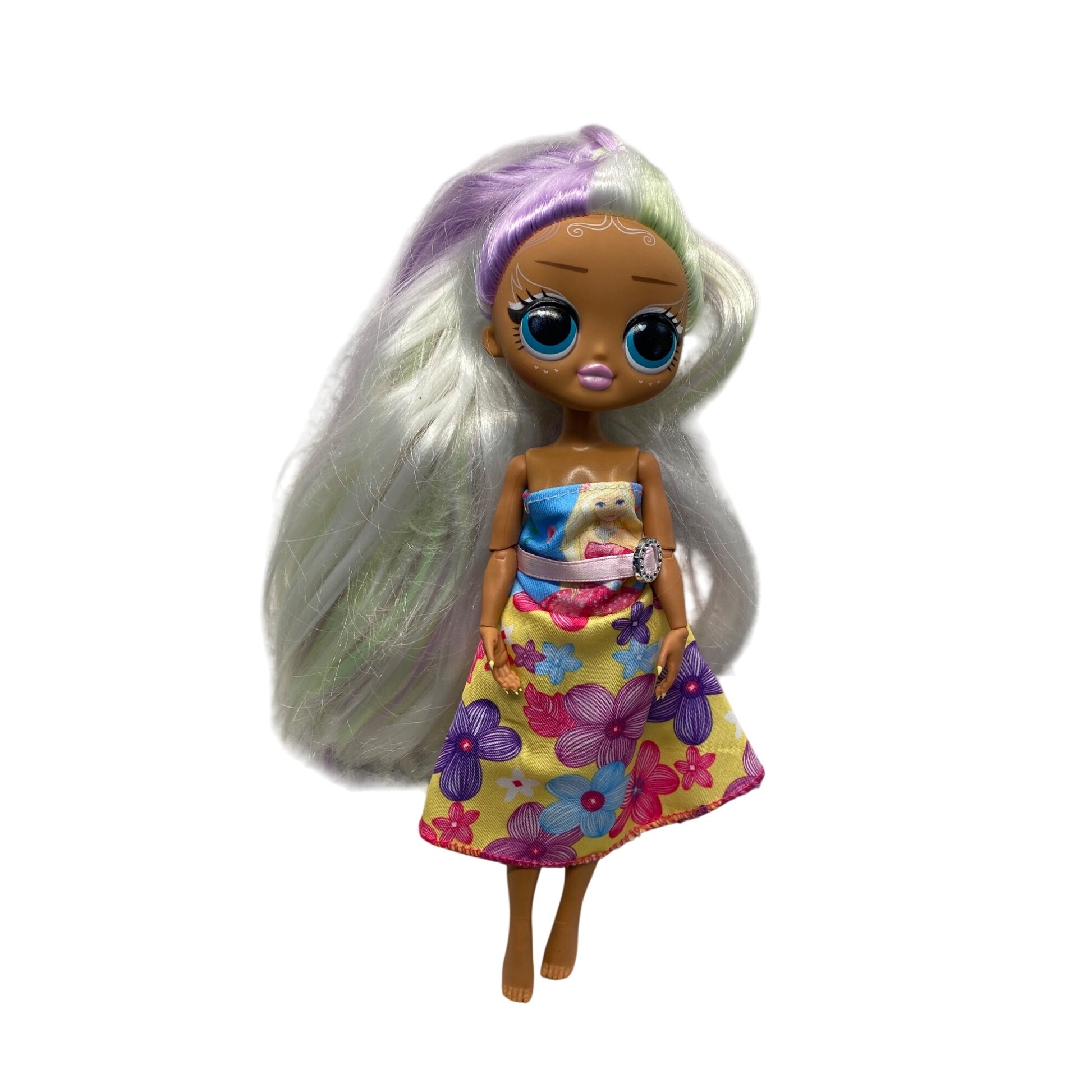 A vibrant addition to any doll collection, this L.O.L. Surprise O.M.G. doll features a colorful floral dress and bold multicolored hair for stylish fun.