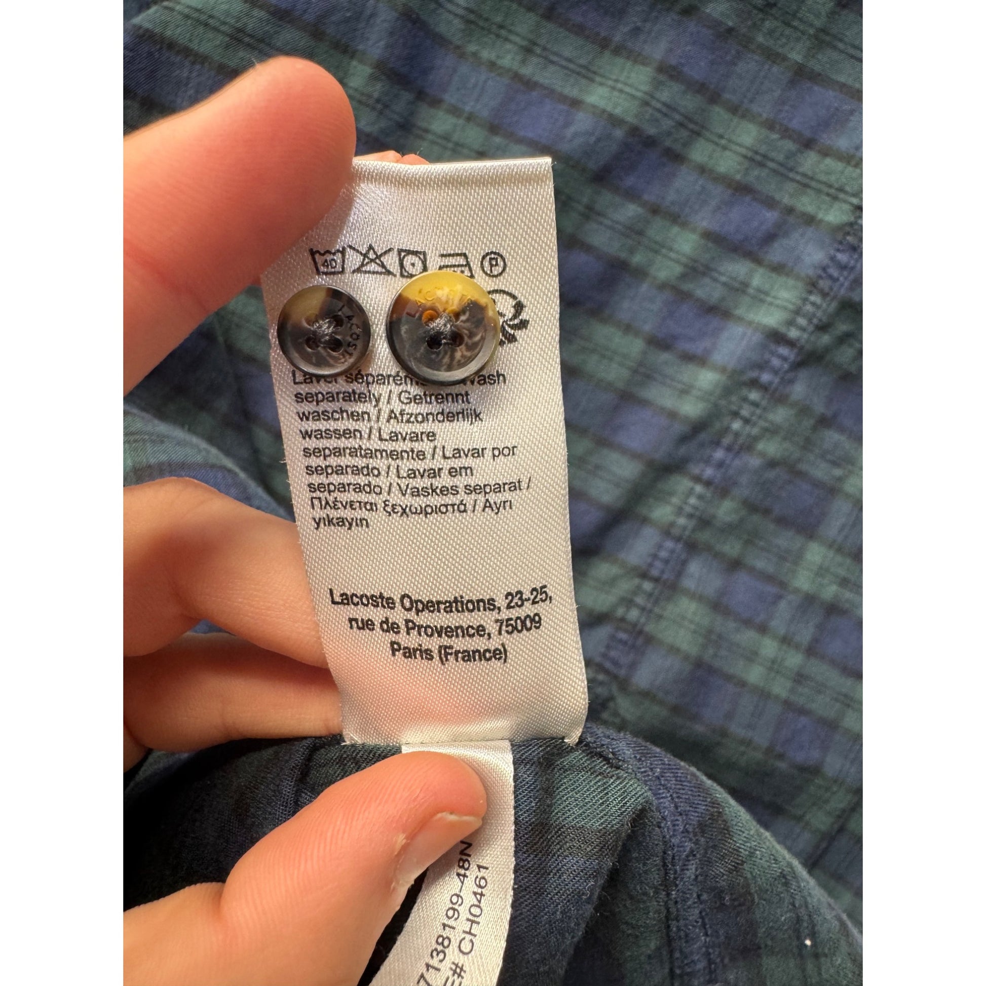This Lacoste men's shirt features a classic plaid pattern in green and blue, offering a sophisticated style suitable for various settings. Made in China, it presents a regular fit and is composed of 100% cotton for comfort. Ideal for professional or casual environments, it pairs well with trousers or jeans.