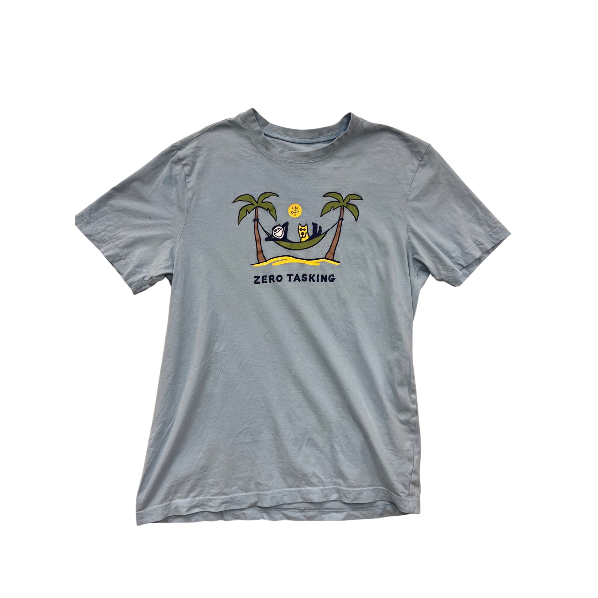 A lightweight and breathable T-shirt with a fun "Zero Tasking" hammock graphic, offering comfort and style for relaxed, everyday wear.