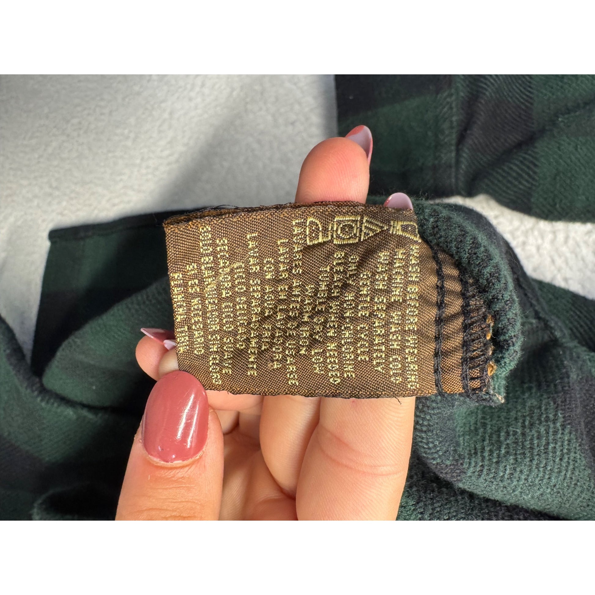 This durable heavyweight flannel shirt offers warmth and style with a classic green and black plaid design. Designed for functionality, it features two chest pockets and a comfortable fit. Ideal for cooler weather and versatile layering.