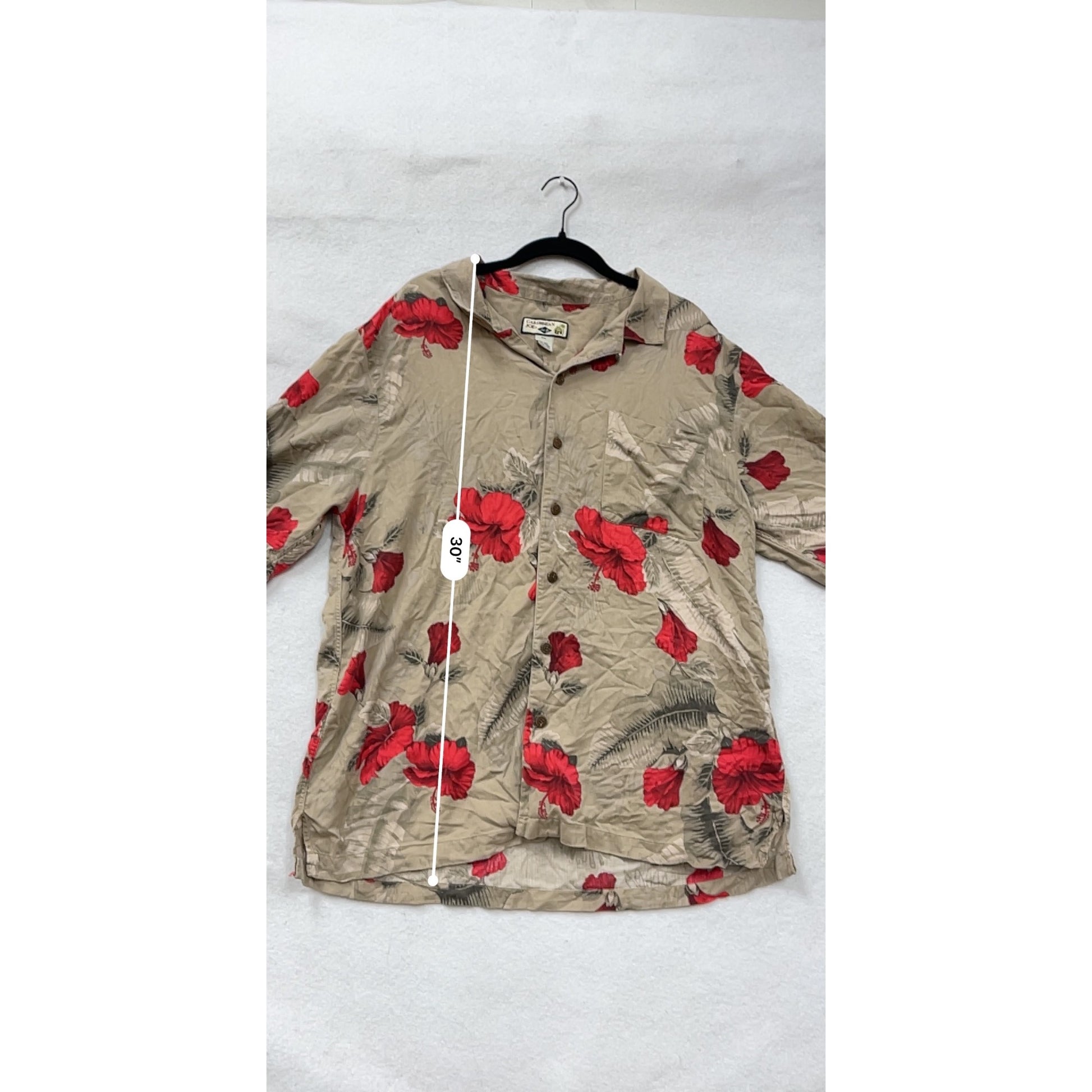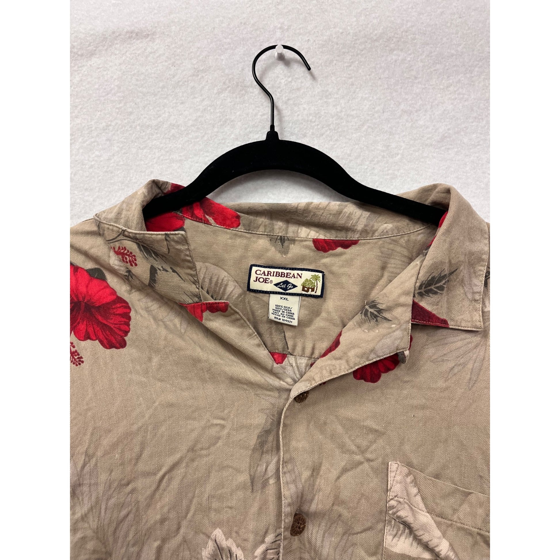 Mens Caribbean Joe Silk XXL Beige Button-Up Shirt With Red Floral Print #6589