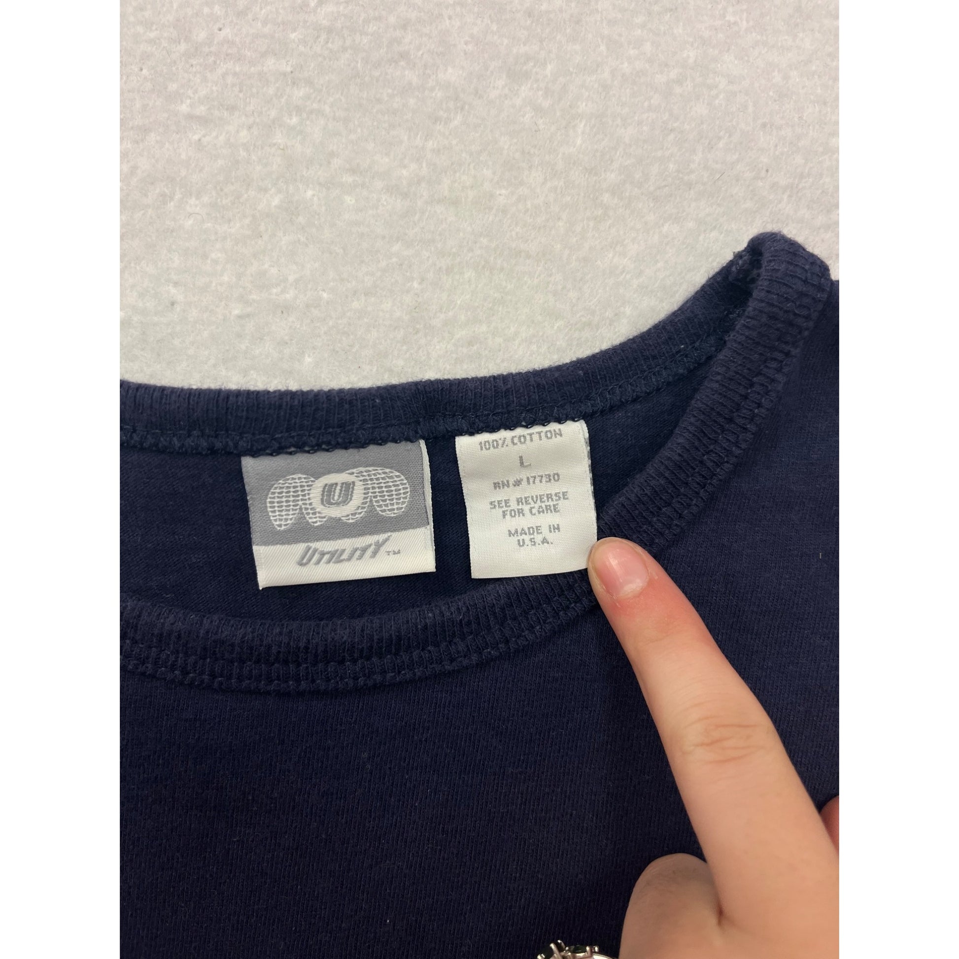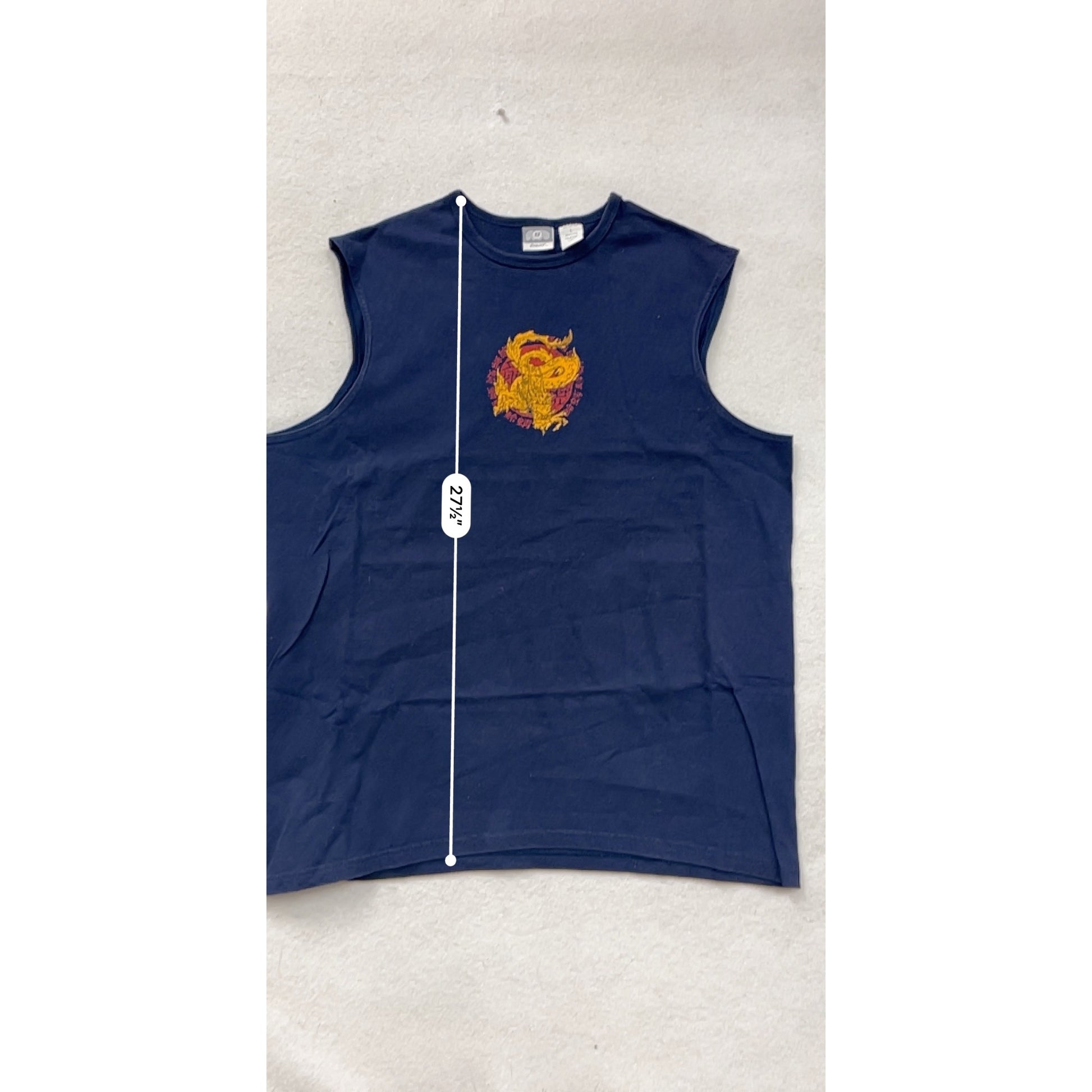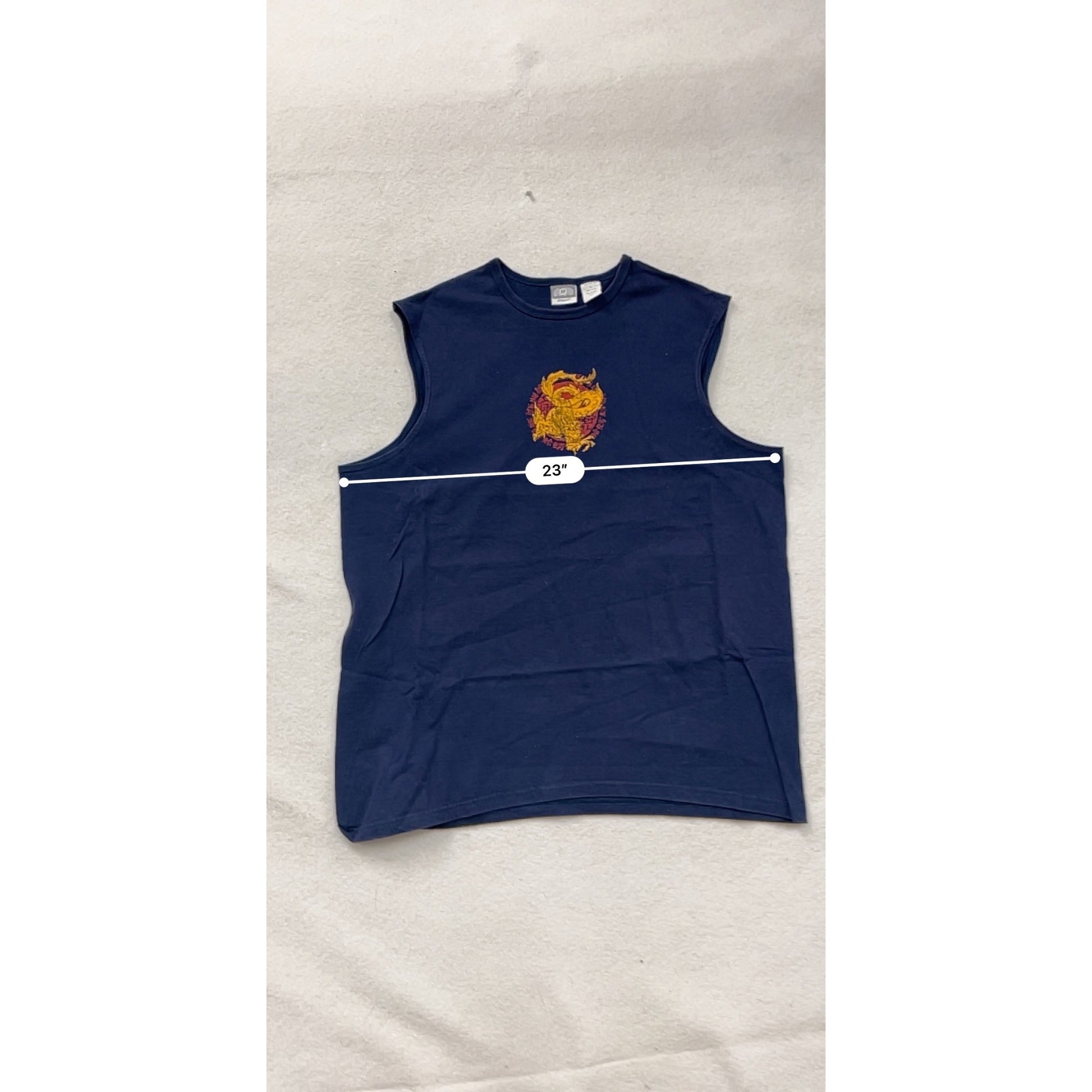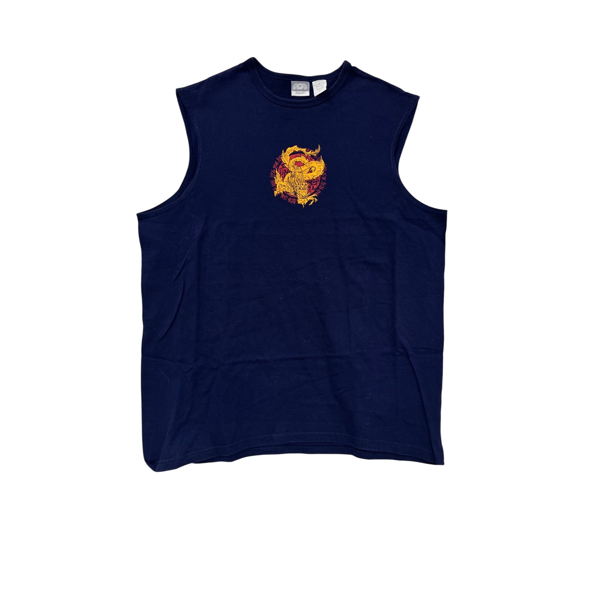 This sleeveless navy shirt features a bold red and yellow dragon design, crafted for durability and comfort. Made in the USA with breathable cotton.