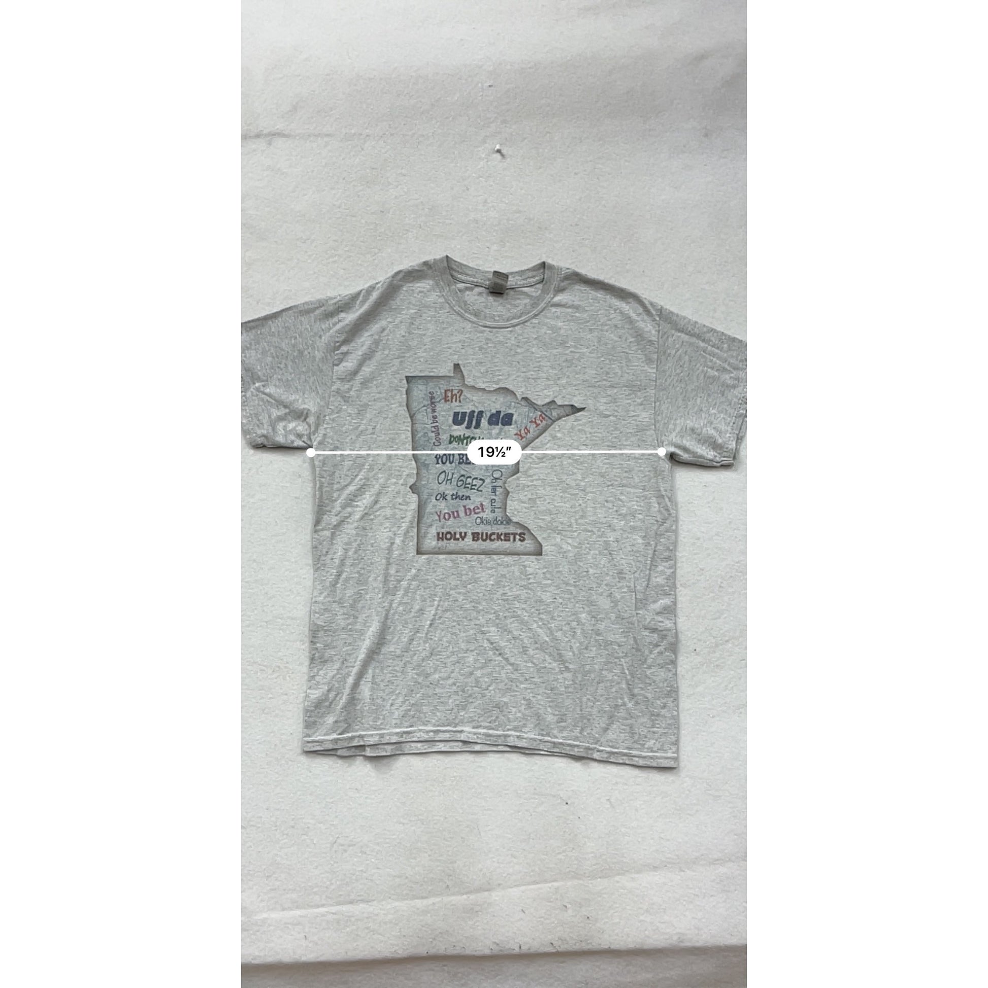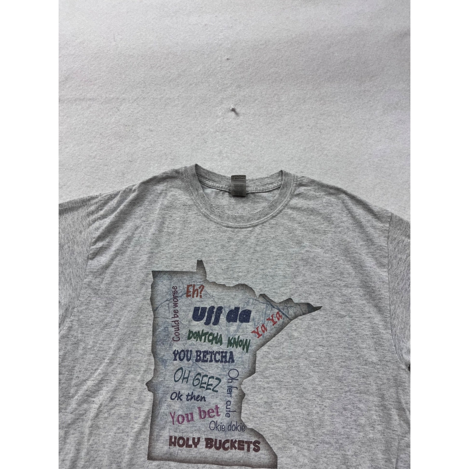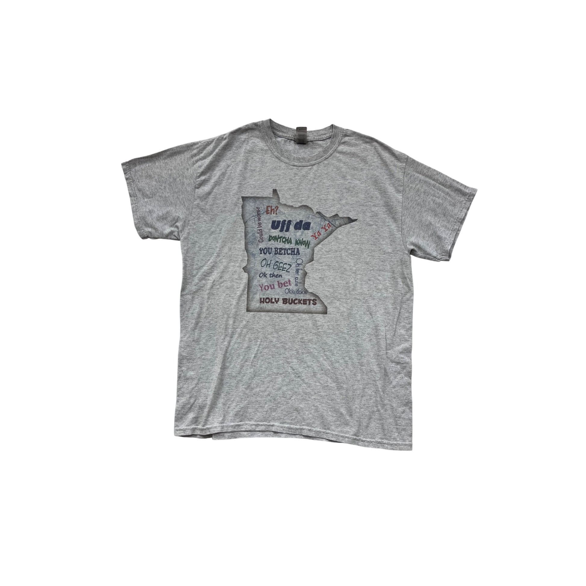 A gray Minnesota-themed graphic tee by Gildan in a men's large size. Crafted from a lightweight cotton/polyester blend, this shirt is both comfortable and breathable.