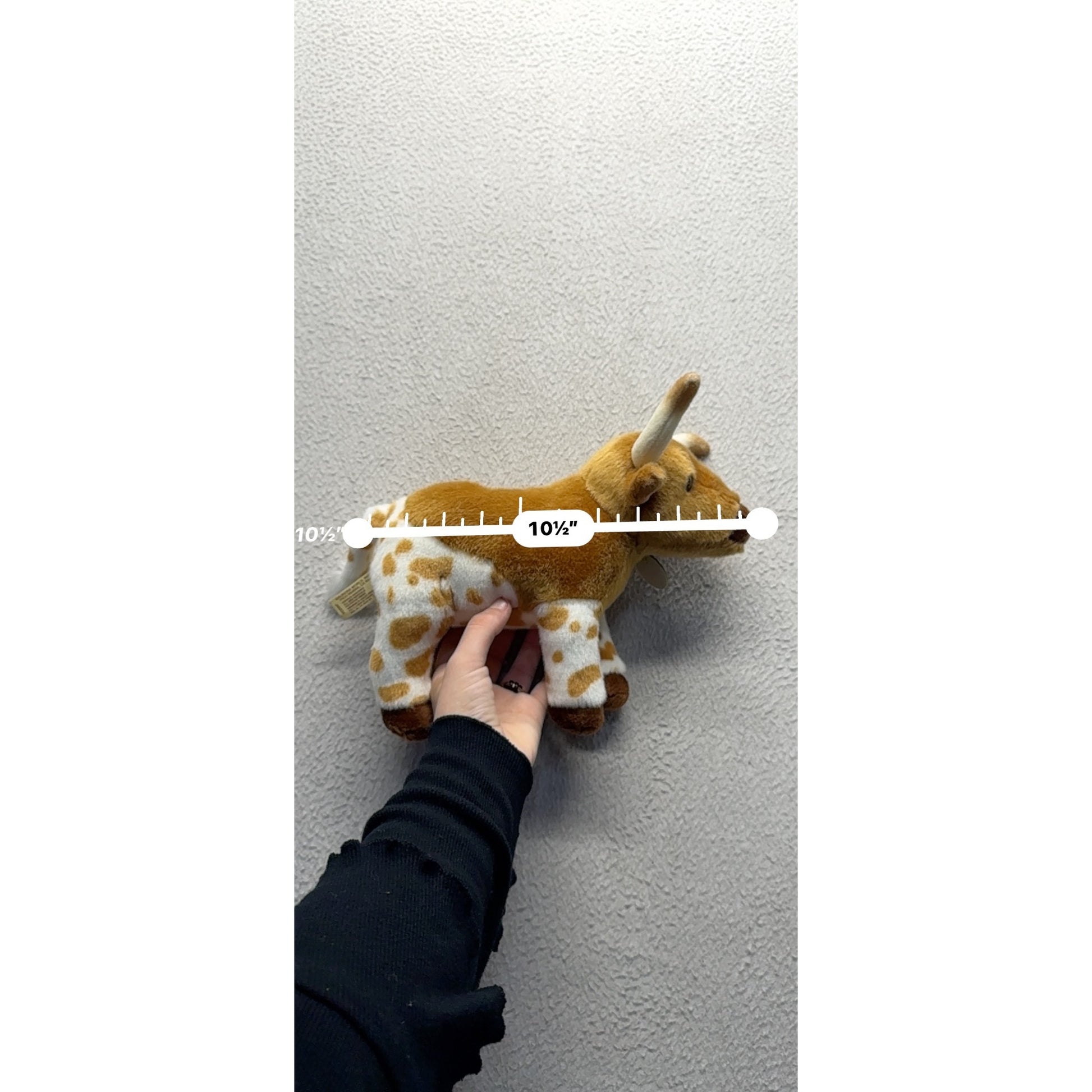 This charming longhorn cow plush by Miyoni is a delightful blend of softness and character. Its intricate spotted design and cuddly texture lend a lifelike appeal perfect for embracing heartfelt moments. Crafted with care, it evokes the pastoral beauty of the countryside, bringing a touch of rustic charm to all who behold it.